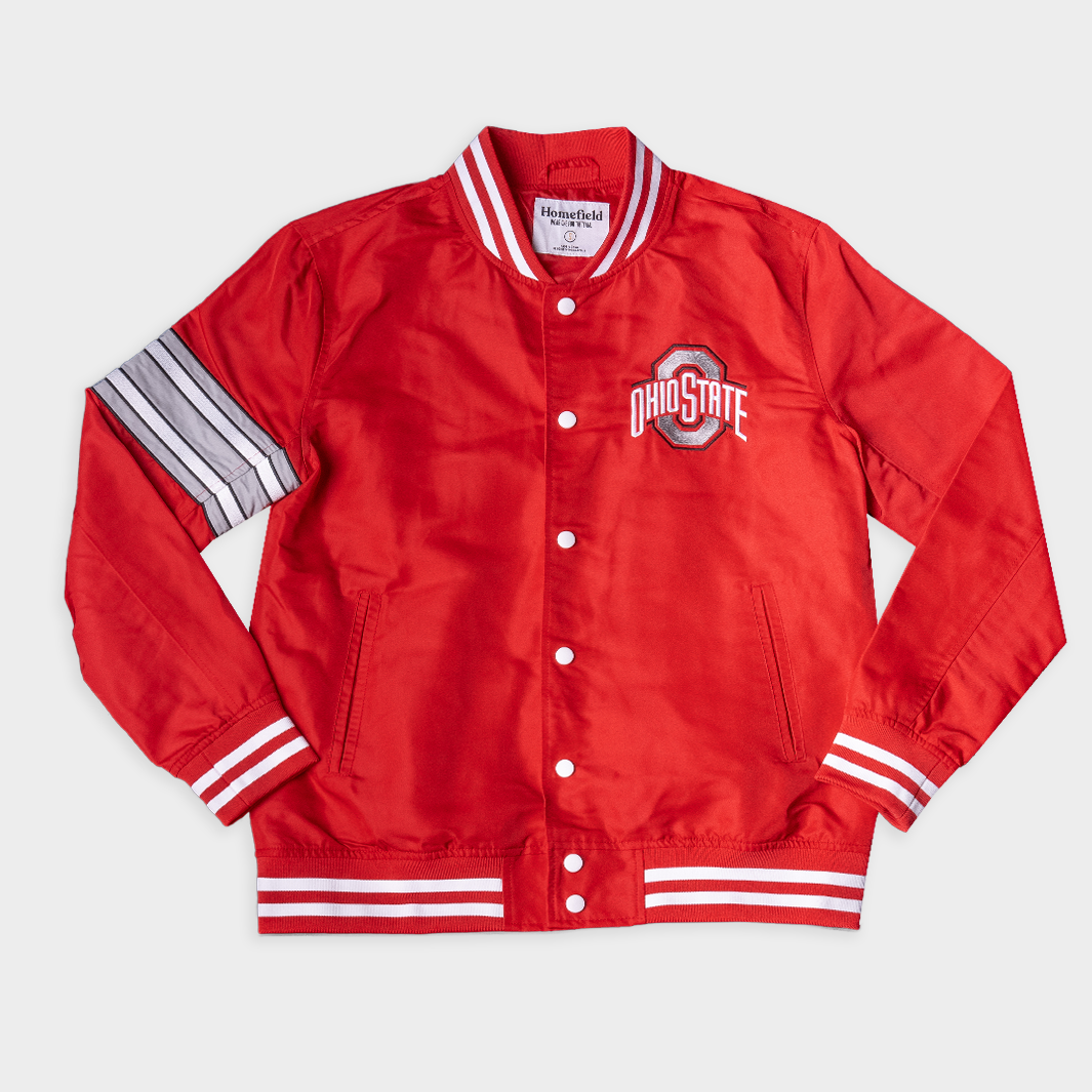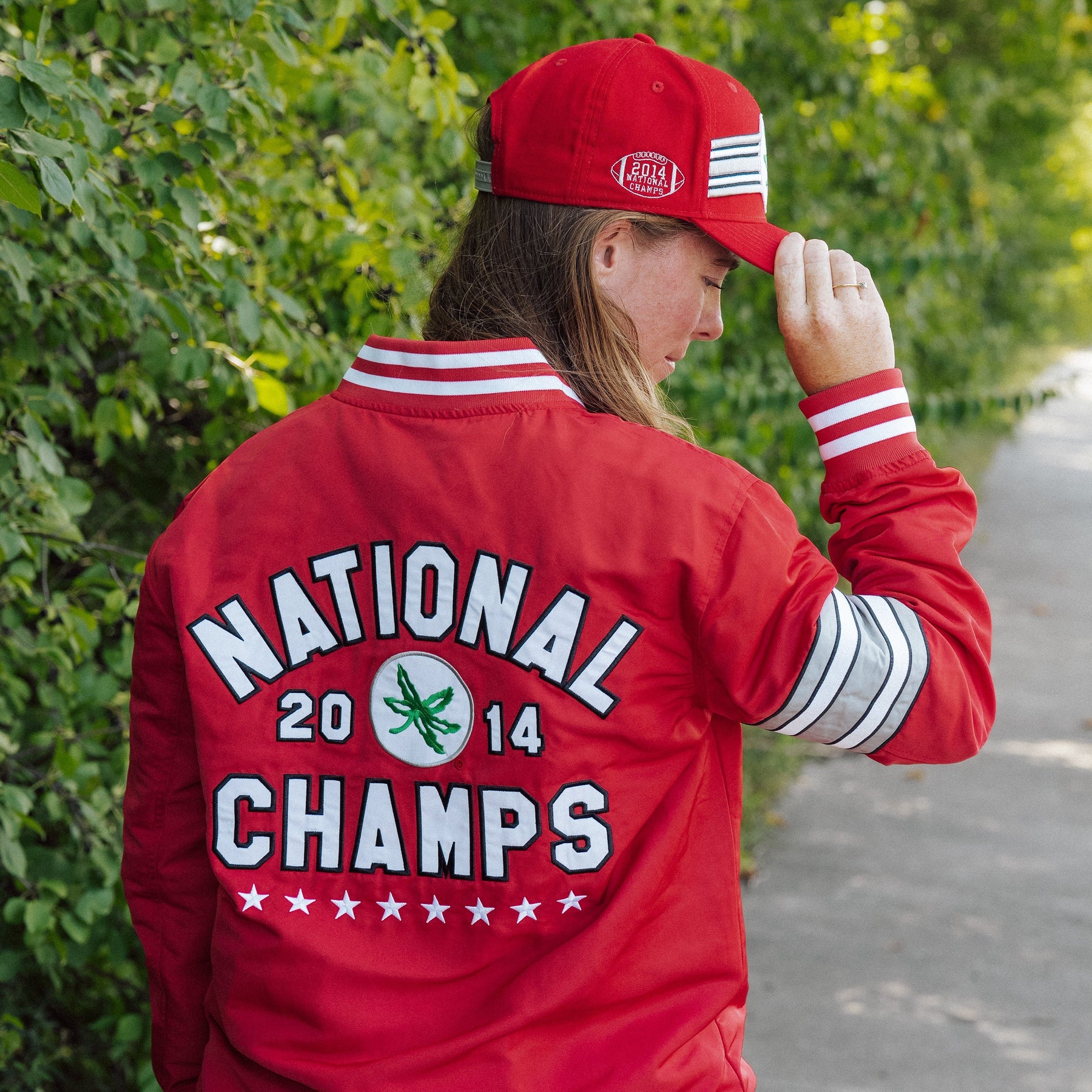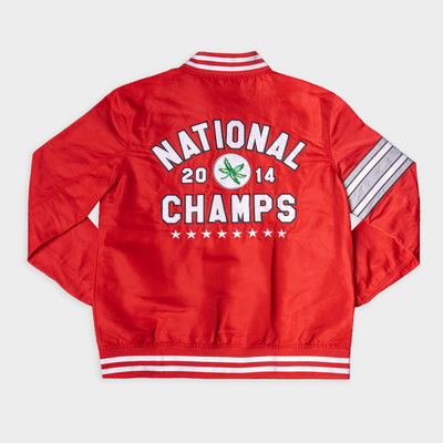 Ohio State set the tone for the College Football Playoff era as the CFP's inaugural National Champions in 2014. The Bucks matched their single-season win record with 14 wins, bouncing back after a loss to Virginia Tech at The Shoe. The team is remembered for its depth at quarterback, with J.T. Barrett replacing an injured Braxton Miller as starter; Cardale Jones then took over for an injured Barrett for a massive postseason effort. This retro-inspired bomber jacket celebrates their legendary feat.