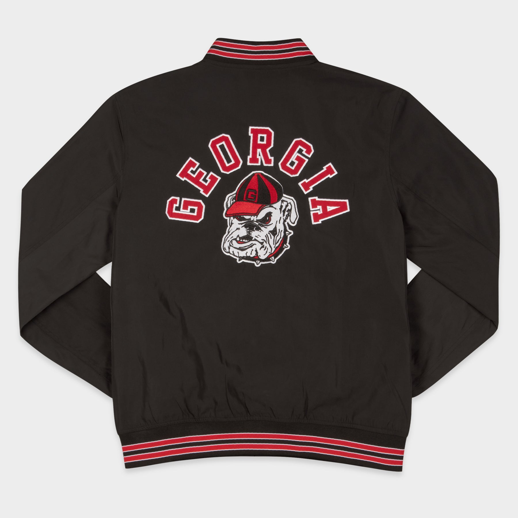 Georgia surprised rival Auburn during a game in 2007, leaving the field after warmups in red jerseys, and returning for pregame in black. The uniform change even surprised the players, who had been hoping for a black jersey, despite it not being a "traditional" Georgia look. The Georgia blackout game inspired this jacket, which features detail work on the inner lining celebrating the Dawgs' four national titles.