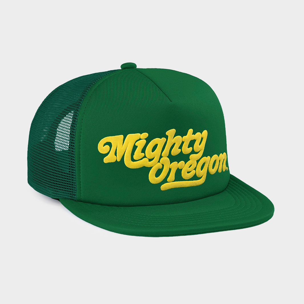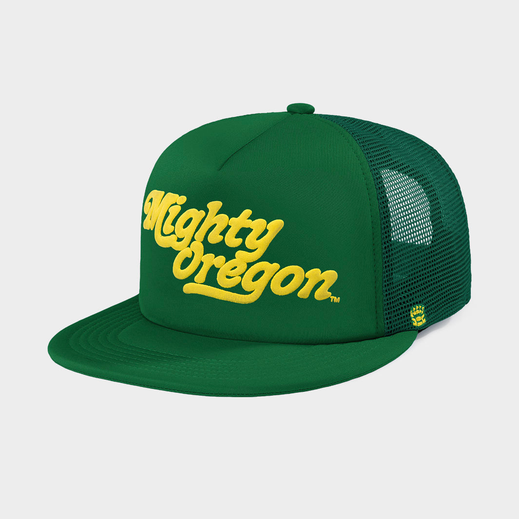 Mighty Oregon! Set on our fan-favorite trucker style, inspired by high-crown, bold hats of yore, this Oregon hat literally makes a statement. The dimensional puff ink adds to this trucker cap's eye-catching design -- it practically screams Ducks, if you ask us.