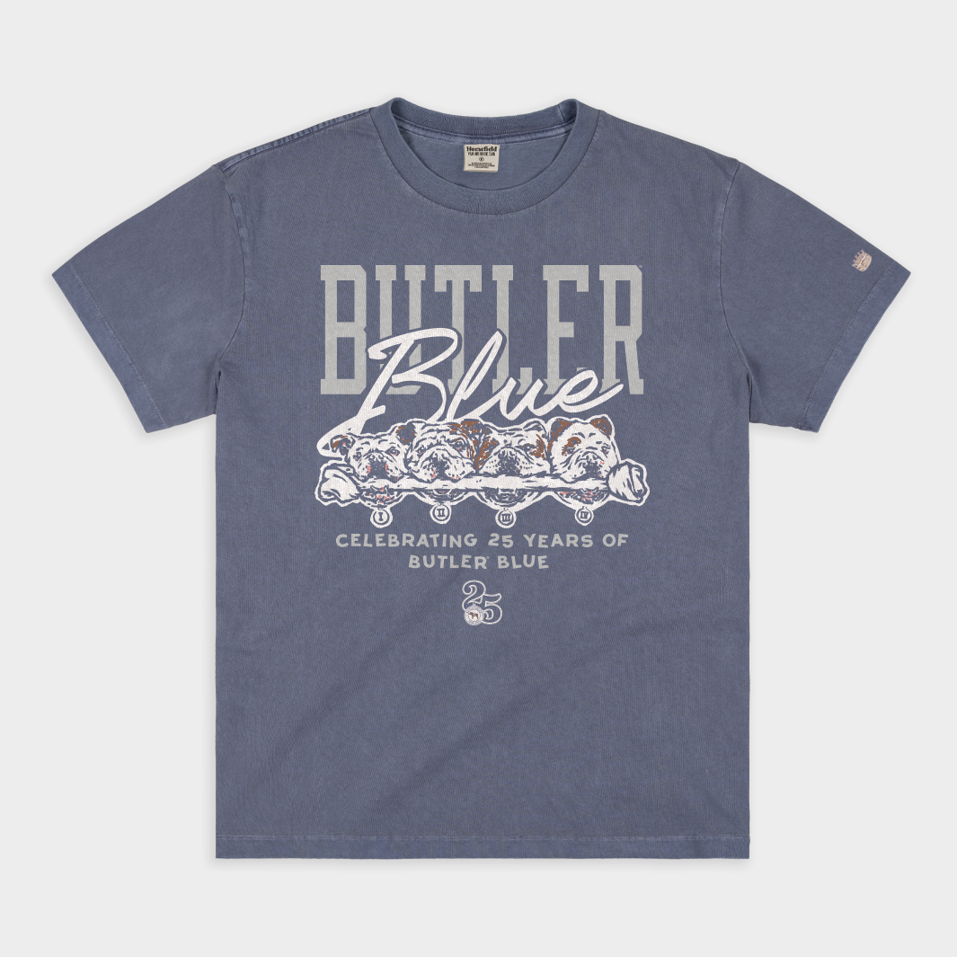 Since 2000, Butler has had an official, live bulldog mascot, after dabbling in unofficial dog mascots throughout the 1900s. Butler Blue was an instant hit, delighting generations of dedicated Butler fans. This design showcases and celebrates all four Butler Blues, including VIP (Very Important Pup) and friend of Homefield, Blue IV.