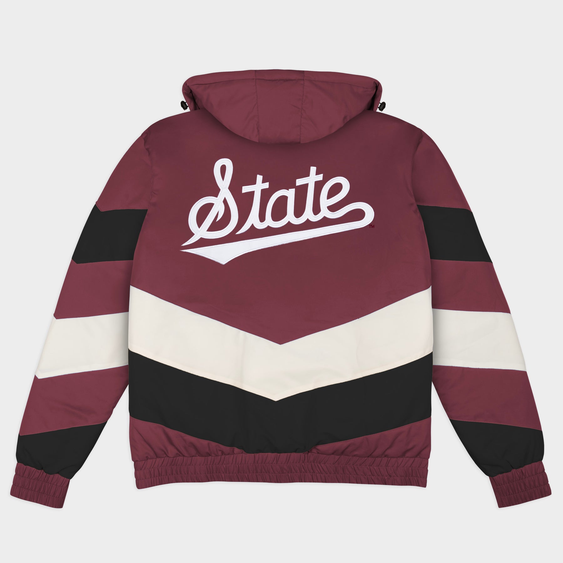 Change the winter jacket game with the Mississippi State Gamebreaker Jacket. Inspired by the bold, maximal sportstyle jackets of the 1990s, each jacket is designed with a high neck and removable hood to withstand whatever elements the day throws at you. The chevron stripes and classic, vintage logos on the chest and back paint the quintessential game day fashion picture.