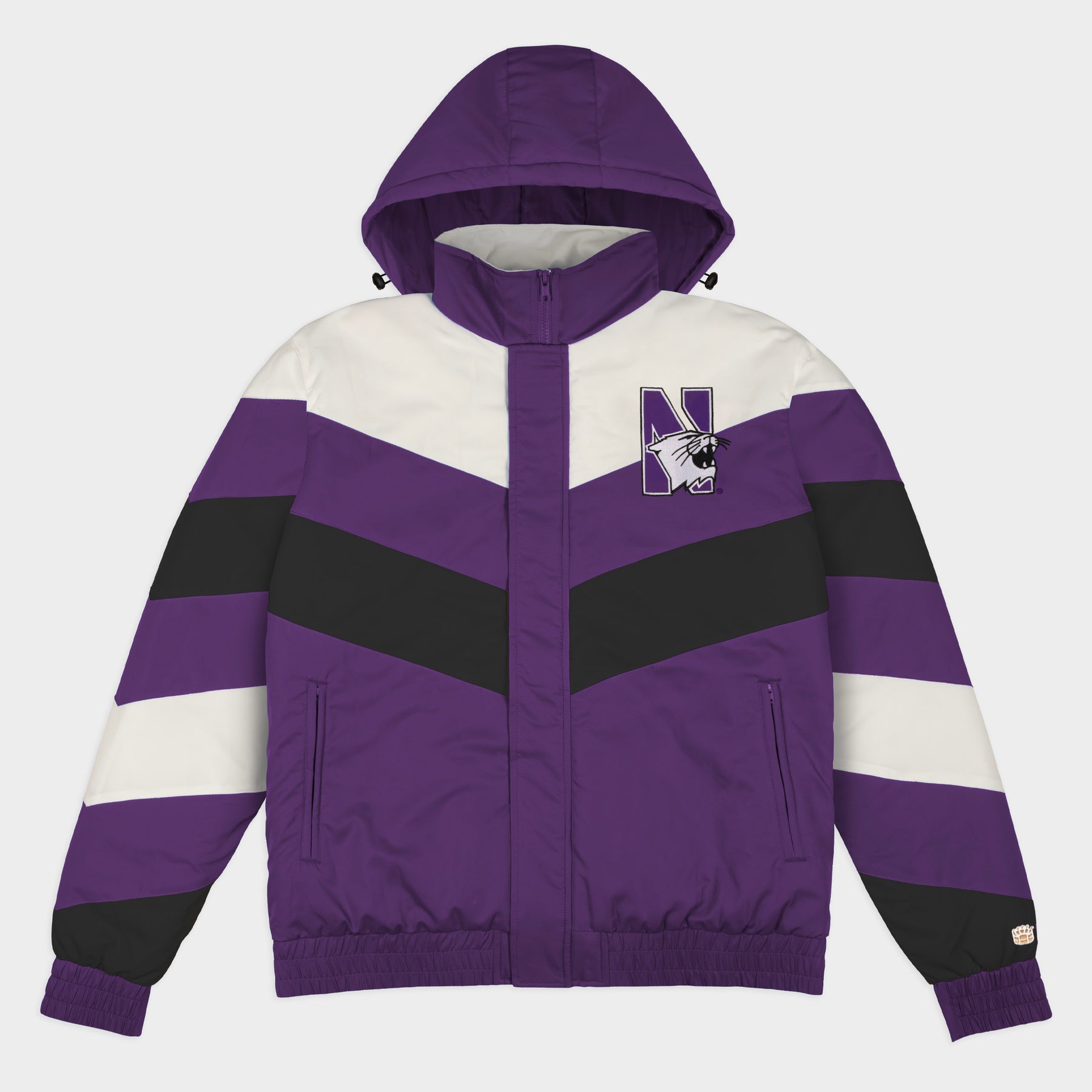 Change the winter jacket game with the Northwestern Gamebreaker Jacket. Inspired by the bold, maximal sportstyle jackets of the 1990s, each jacket is designed with a high neck and removable hood to withstand whatever elements the day throws at you. The chevron stripes and classic, vintage logos on the chest and back paint the quintessential game day fashion picture.