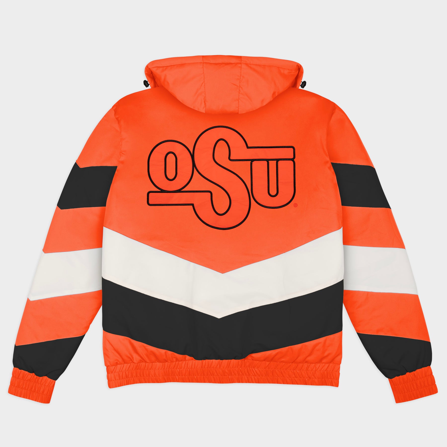 Change the winter jacket game with the Oklahoma State Gamebreaker Jacket. Inspired by the bold, maximal sportstyle jackets of the 1990s, each jacket is designed with a high neck and removable hood to withstand whatever elements the day throws at you. The chevron stripes and classic, vintage logos on the chest and back paint the quintessential game day fashion picture.