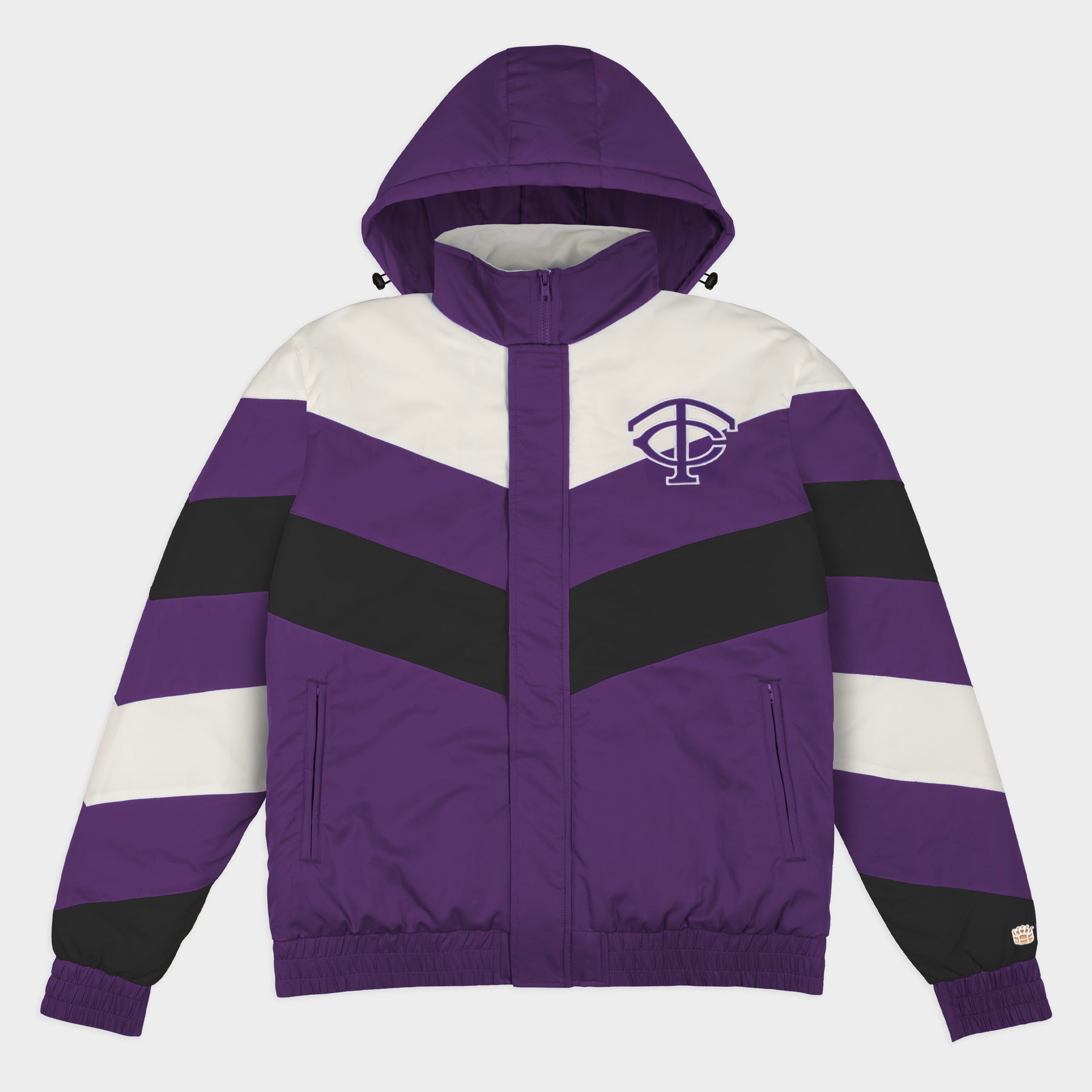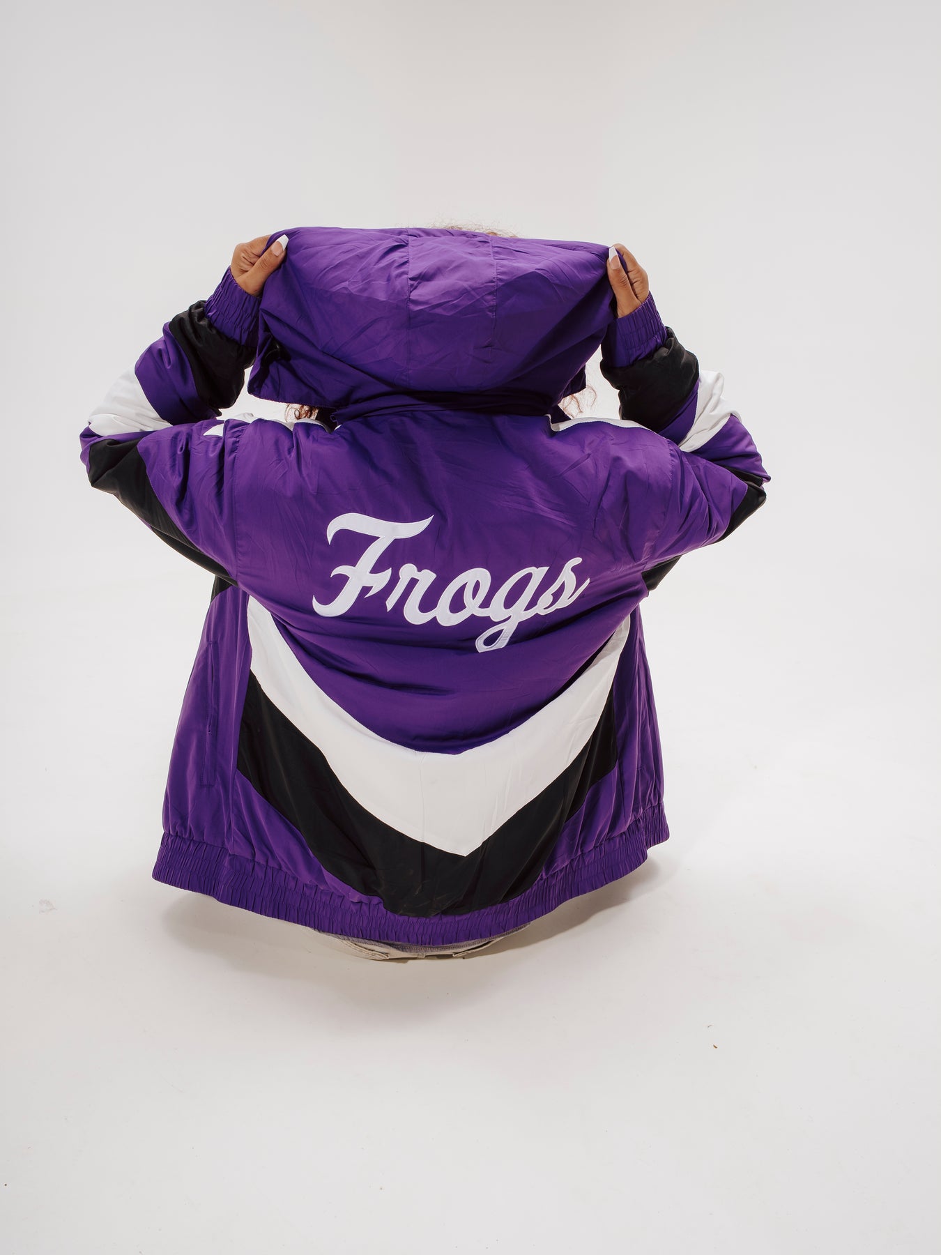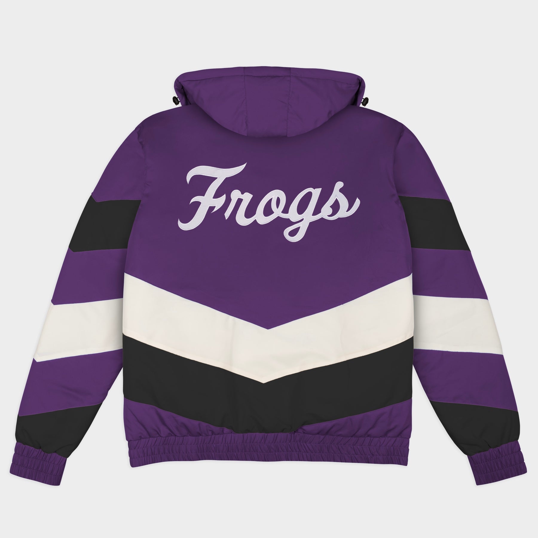Change the winter jacket game with the TCU Gamebreaker Jacket. Inspired by the bold, maximal sportstyle jackets of the 1990s, each jacket is designed with a high neck and removable hood to withstand whatever elements the day throws at you. The chevron stripes and classic, vintage logos on the chest and back paint the quintessential game day fashion picture.