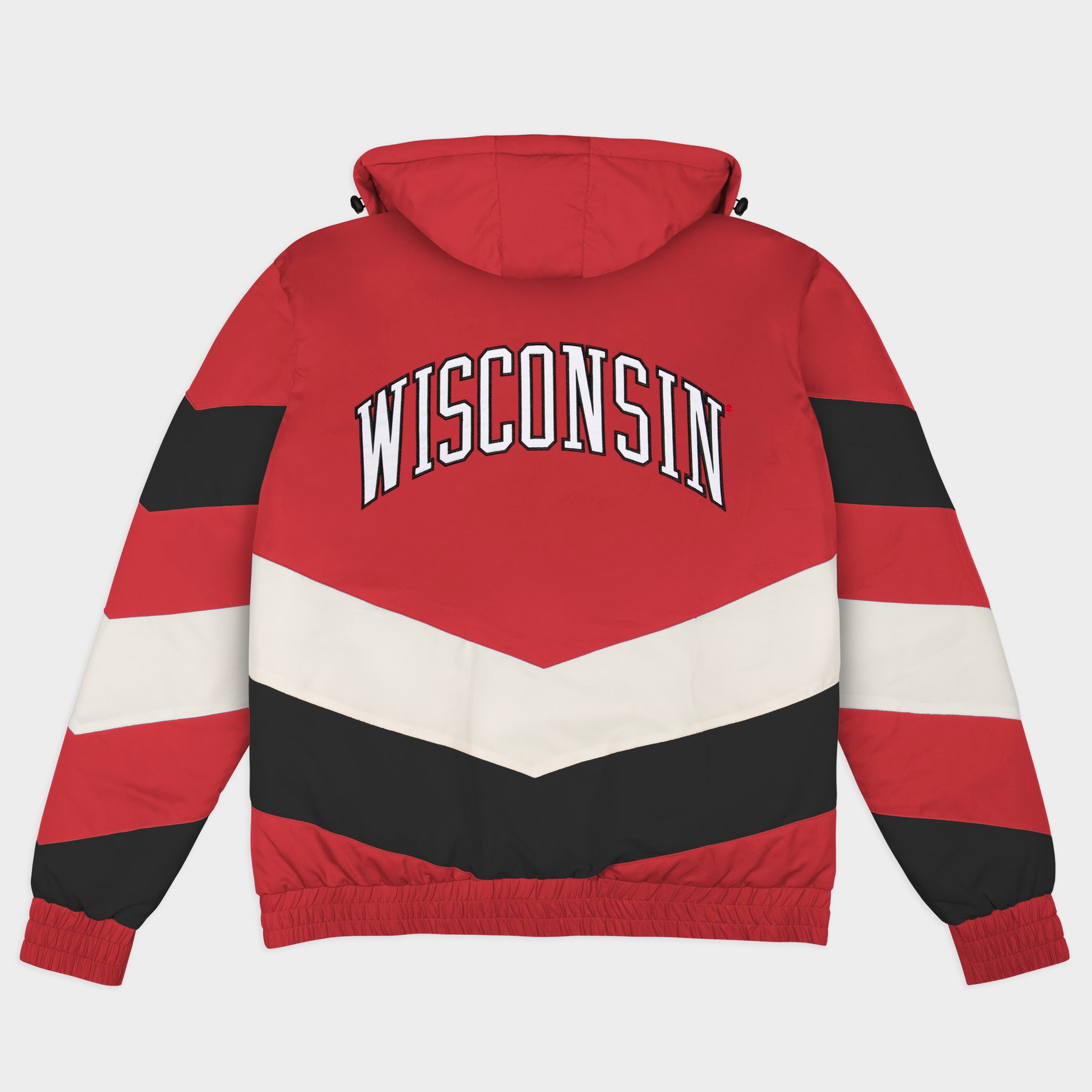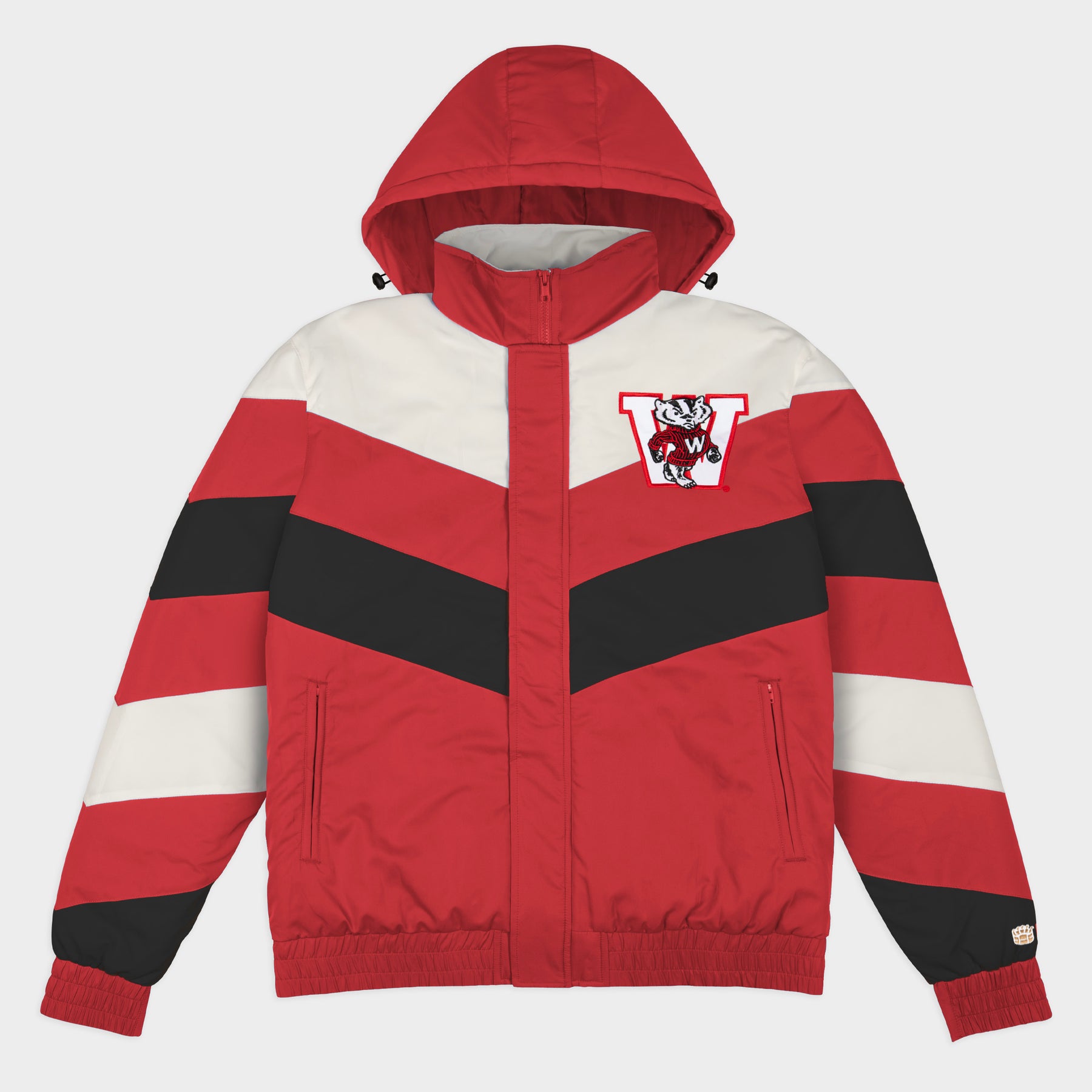 Change the winter jacket game with the Wisconsin Gamebreaker Jacket. Inspired by the bold, maximal sportstyle jackets of the 1990s, each jacket is designed with a high neck and removable hood to withstand whatever elements the day throws at you. The chevron stripes and classic, vintage logos on the chest and back paint the quintessential game day fashion picture.
