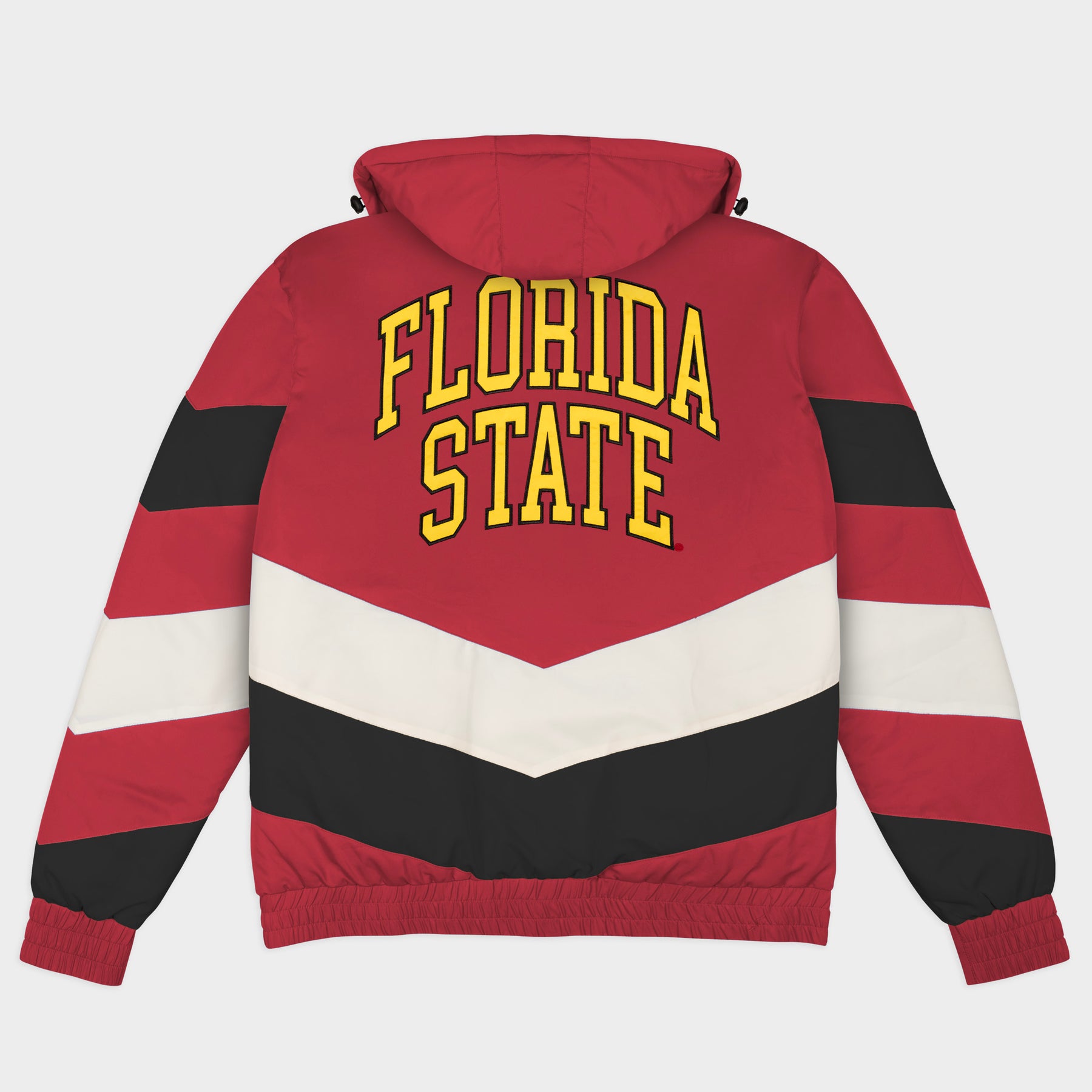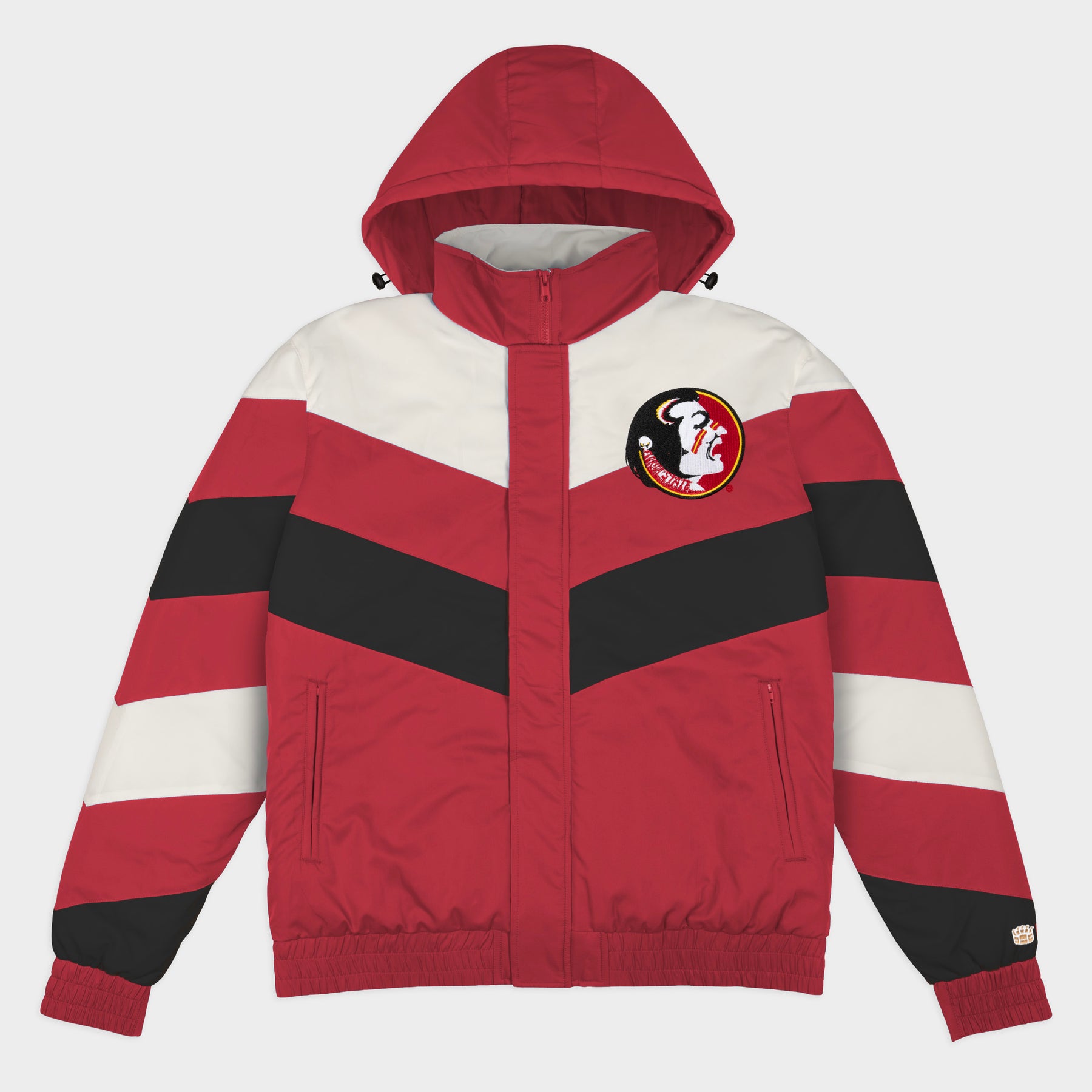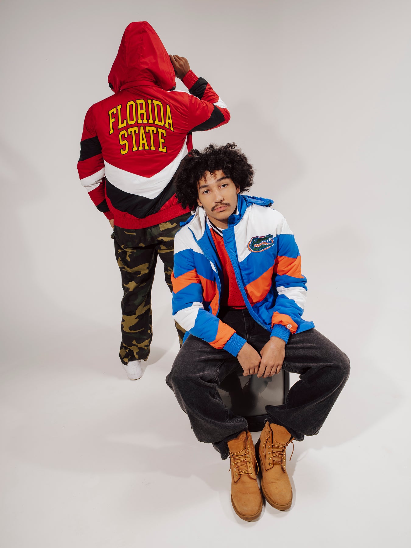 Change the winter jacket game with the Florida State Gamebreaker Jacket. Inspired by the bold, maximal sportstyle jackets of the 1990s, each jacket is designed with a high neck and removable hood to withstand whatever elements the day throws at you. The chevron stripes and classic, vintage logos on the chest and back paint the quintessential game day fashion picture.