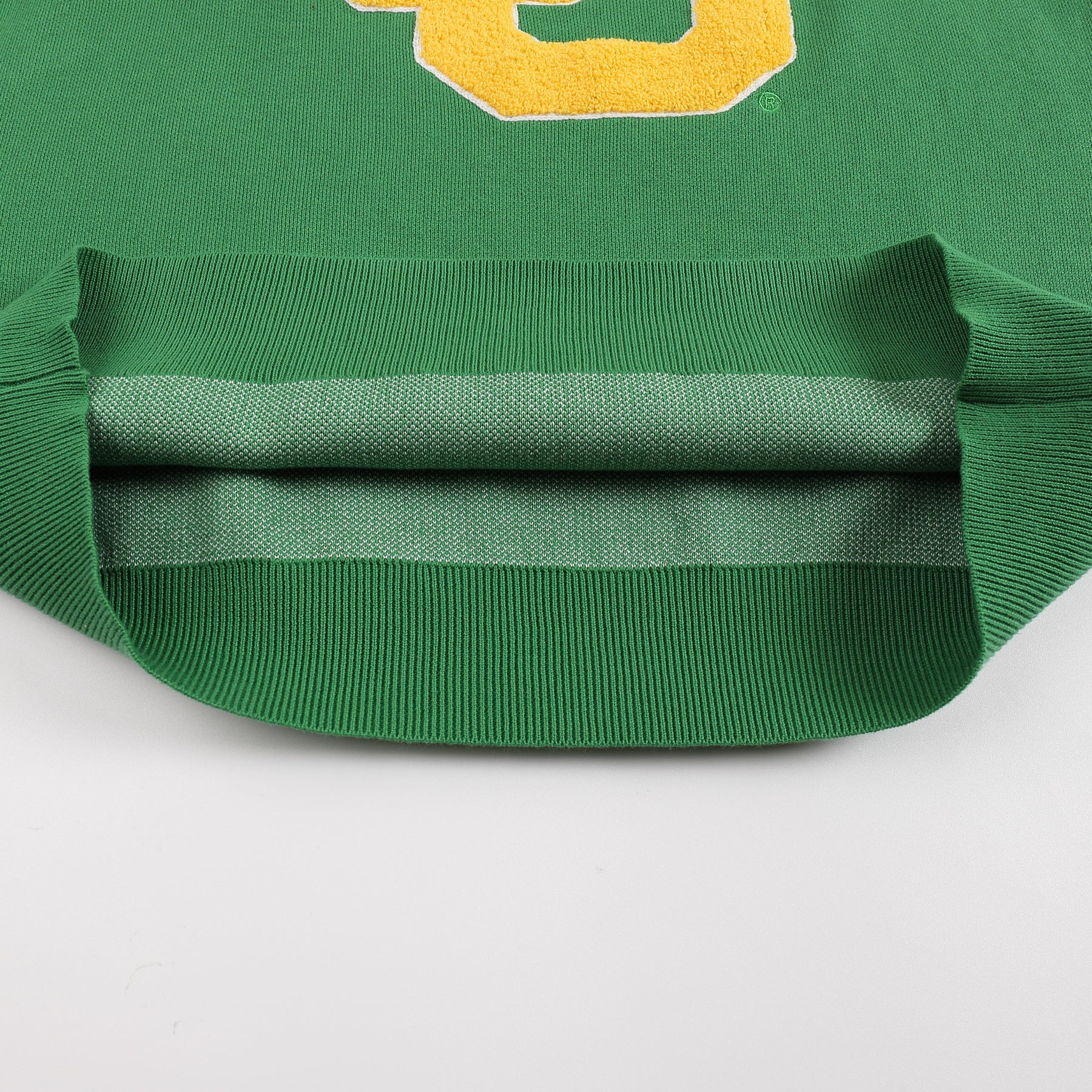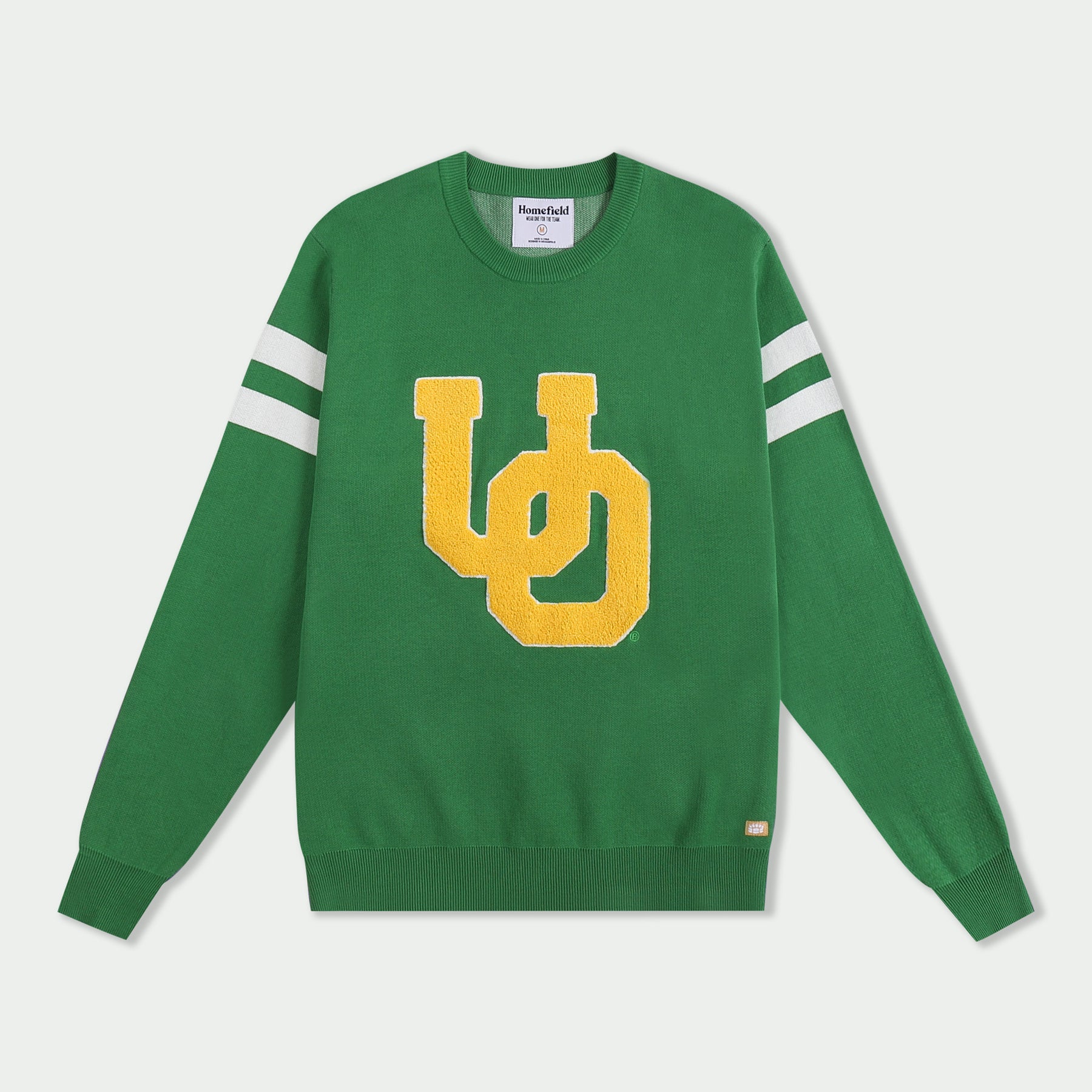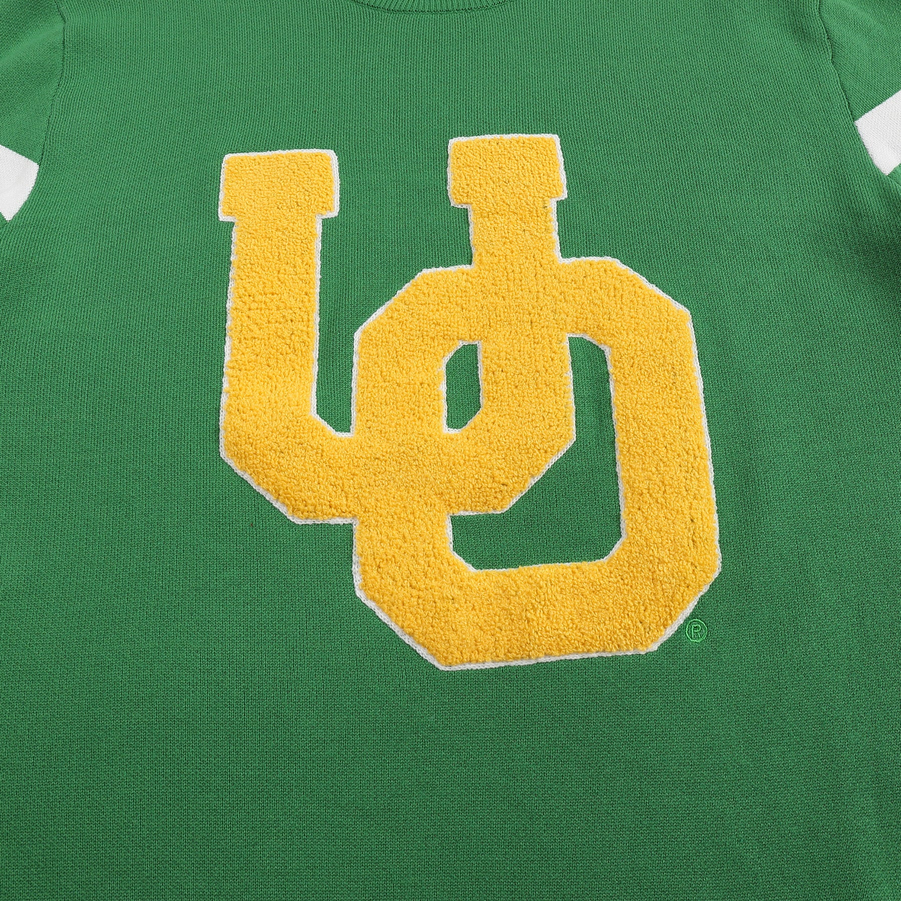 While Oregon is best known nationally for its bold, rounded “O” logo, they’ve also used this interlocked, varsity-style “UO” for decades. Upon the official adoption of their now-iconic “O” in 1999, the Ducks rotated this mark in with their other iconic looks, including their famous duck wing and webbed foot logos. We re-envisioned the logo as a varsity, chenille patch, set on our premium knit sweater.