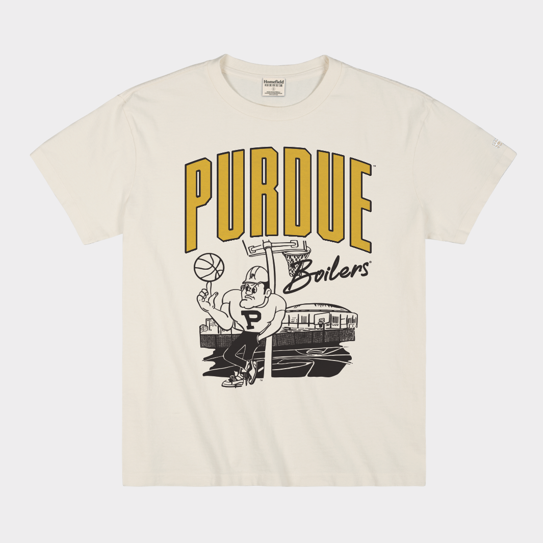Inspired by a Purdue basketball camp illustration from the 1980s, this design is a more casual nod to Boiler ball. Pickup Pete is a menace on the court.