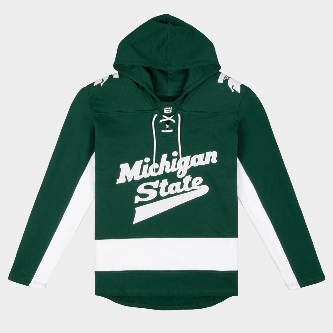 Our Michigan State Hockey Rinkside Hoodie is dedicated to the Spartans’ classic jerseys they’ve worn for decades. MSU hockey began play in 1922, quite literally “on the banks of the Red Cedar,” before the team was briefly discontinued until after World War II. From there, Michigan State hockey became one of the nation’s premier teams, with incredible future NHLers and Olympians wearing the green and white. Brought to you in partnership with College Vault.