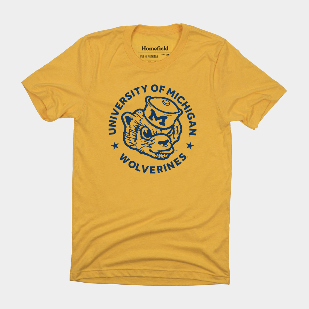 This sailor hat Wolverine was used by the University of Michigan from 1948-1963. We've brought back this beloved mark on our soft maize tee. Brought to you in partnership with College Vault.