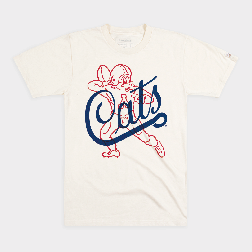 This Arizona Wildcat is throwing it deep with a steady, sure paw. We first found him on a 1953 Arizona football advertisement, and paired him with a complementary, vintage "Cats" script.