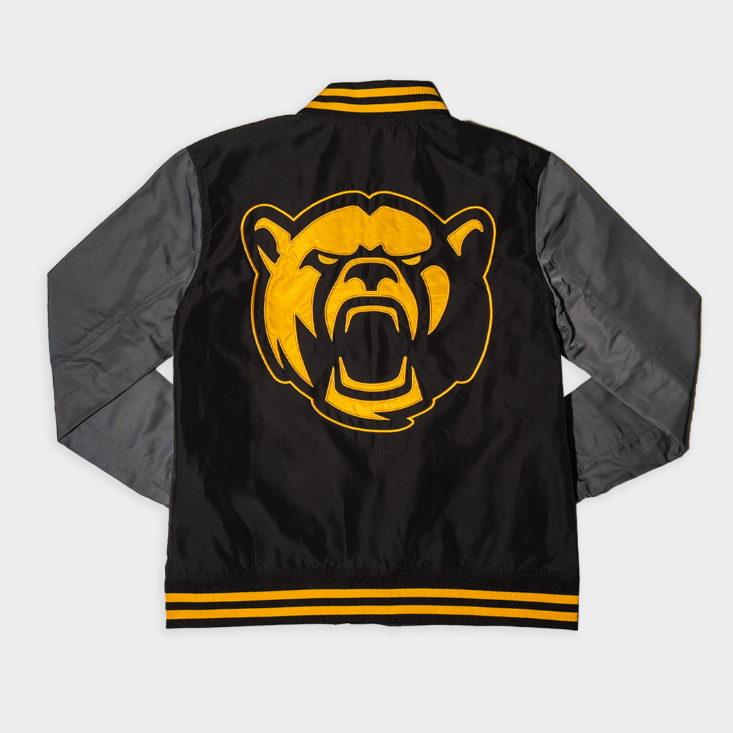 As a nod to Baylor football's anthracite uniforms, we designed this sleek, two-tone bomber jacket featuring statement Baylor Bears logos.