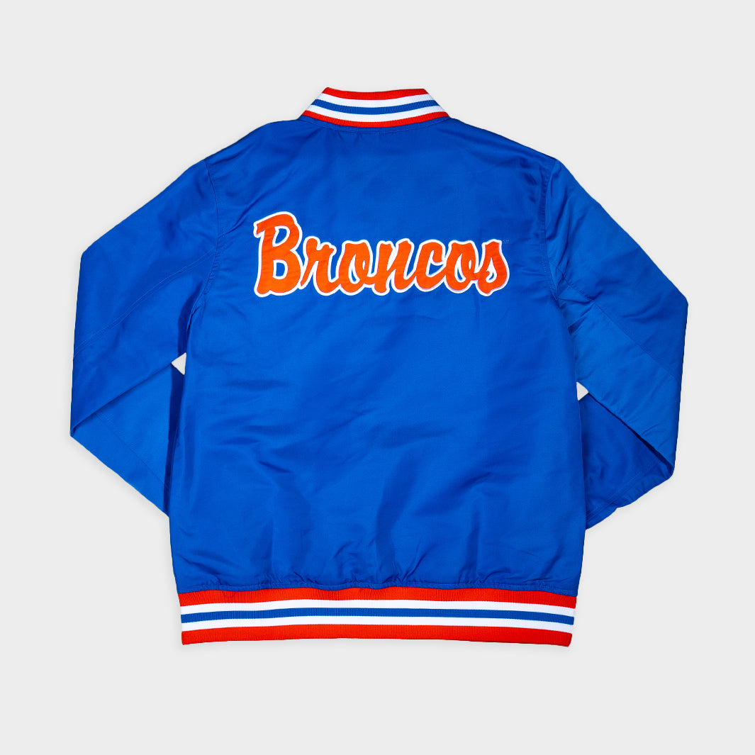 This classic Boise State logo—a bronco on its hind legs in front of the Idaho state outline—was created in 1974, an exciting time for the university and football program. The Broncos had just moved up to Division II in 1970 and won three straight Big Sky Conference football titles from 1973-1975 in their brand new Bronco Stadium. For this bomber jacket, we paired the logo with a bespoke, retro "Broncos" script. Brought to you in partnership with College Vault.