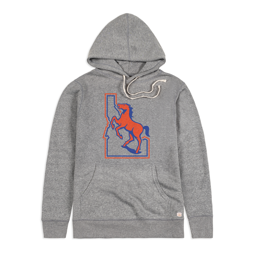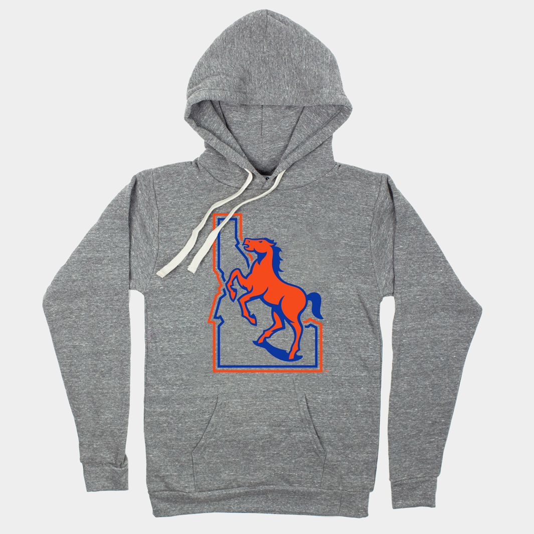 This classic Boise State logo—a bronco on its hind legs in front of the Idaho state outline—was created in 1974, an exciting time for the university and football program. The Broncos had just moved up to Division II in 1970 and won three straight Big Sky Conference football titles from 1973-1975 in their brand new Bronco Stadium. Celebrate that era of Boise State history in the most comfortable hoodie you could ever imagine. Brought to you in partnership with College Vault.