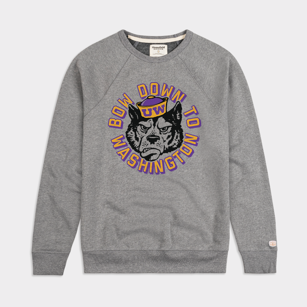 Who doesn’t love a vintage mascot wearing a classic sailor hat? We paired this mid-century UW Husky with lyrics from their iconic fight song, “Bow down to Washington” for this amazingly soft crewneck sweatshirt.