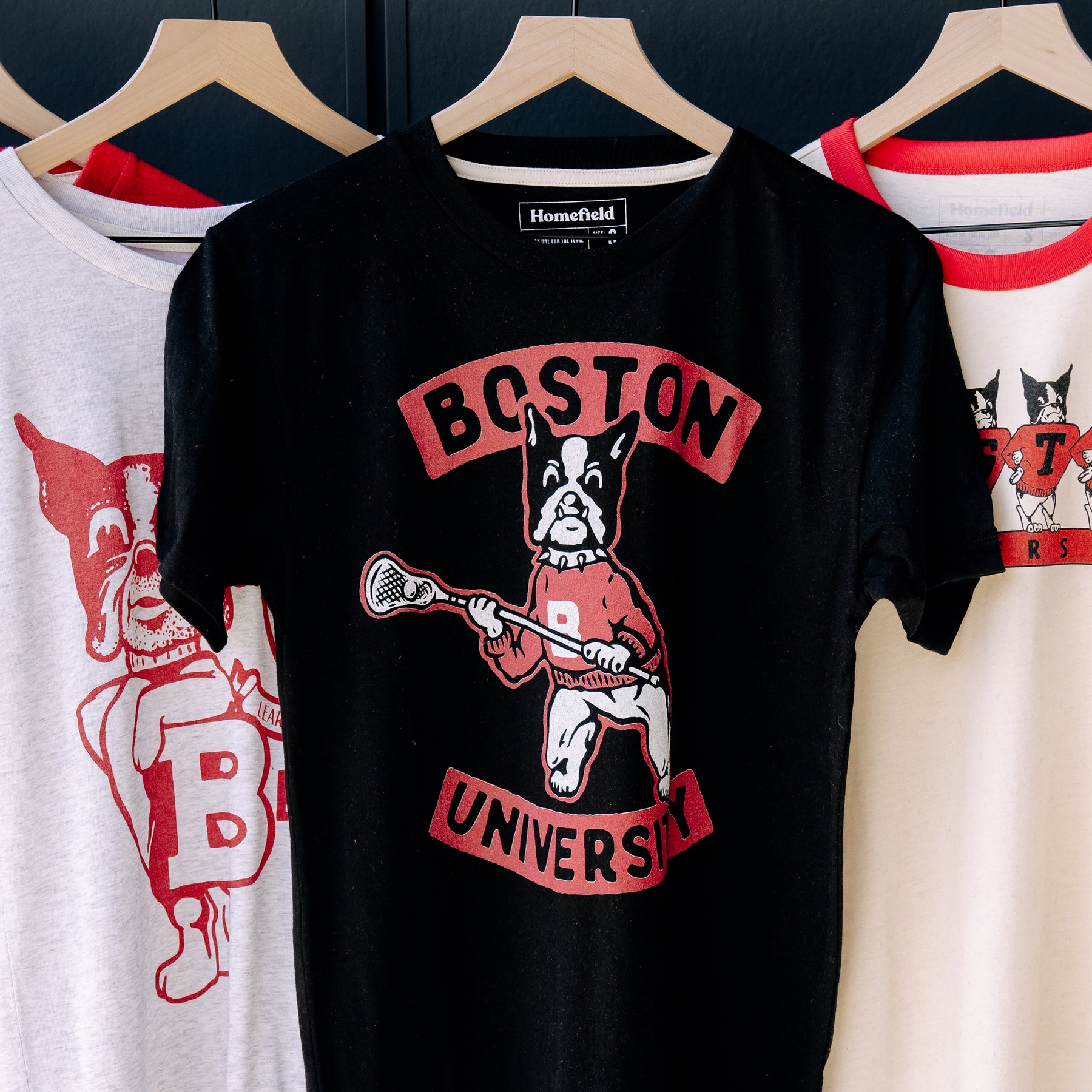 Though lacrosse is a relatively new sport at BU, the Terriers have established themselves quickly as a force. The men’s team has a penchant for toppling ranked opponents, including a ranked victory against No. 2 Loyola in 2019. The Terriers won Patriot League regular season championships in 2022 and 2023, and advanced to the NCAA tournament in 2022. All signs point to upward momentum for BU, and this vintage-inspired design is a unique way to connect their proud sports legacy with their teams of the future.