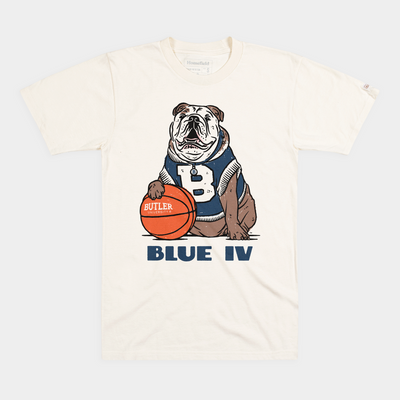 Ever since his official Changing of the Collar on February 29, 2020, Butler Blue IV has served proudly as the official mascot of Butler University. Blue has been part of the Butler community from the start -- his breeders, handler, and veterinarian are all Butler alums. This original illustration captures Blue in his element, ready to root on the Bulldogs at Hinkle Fieldhouse with a basketball in paw.