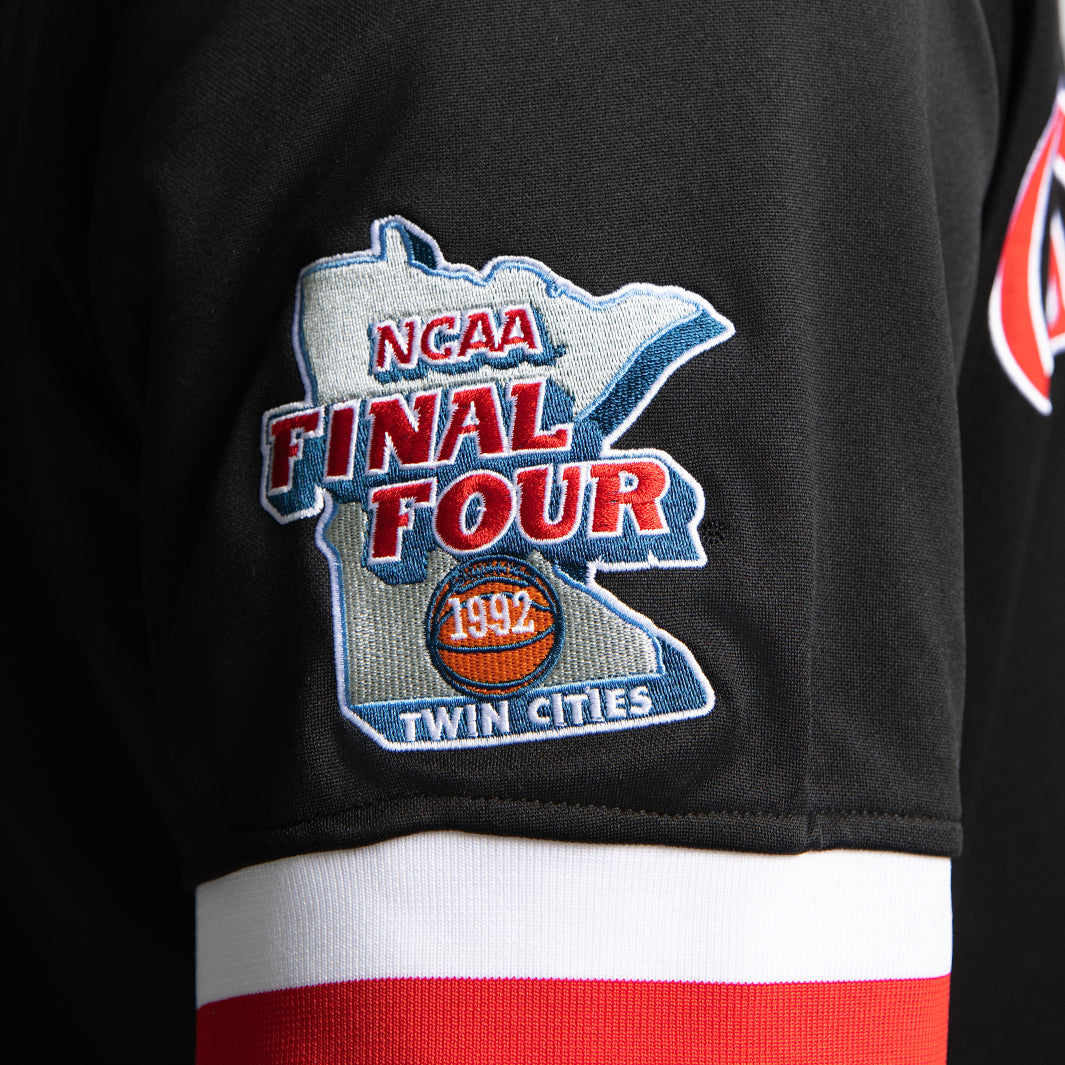 Led by coach Bob Huggins, the 1992 Cincinnati Bearcats celebrated their membership in the brand new Great Midwest Conference by sharing the regular season title and winning the conference tournament. Behind the guard play of Nick Van Exel and scoring of Herb Jones, UC then ran through Delaware, Michigan State, UTEP, and Memphis State in the NCAA tournament by an average margin of 20 points to make their first Final Four since 1963. To celebrate the achievement, we recreated a Bearcats shooting shirt, featuring a 1992 Final Four patch on the sleeve.