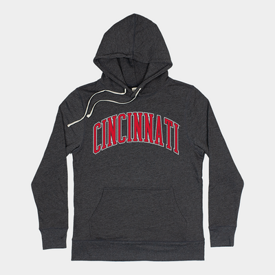 We’re always inspired by retro college gear you’d see on campus back in the day, so we kept it simple with this arched varsity “Cincinnati.” UC has called the Heights neighborhood its main home since 1893, with Forbes even naming West Campus named one of the World’s Most Beautiful College Campuses.