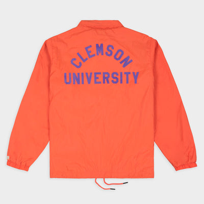 Through the late 1960s and '70s, football coaching staffs transitioned their sideline wardrobes from full suits and ties to light, workmen-style jackets; these coaches jackets were predecessors to the more spirited, uniformly branded looks we see on the sidelines today. Our take on a Clemson coaches jacket matches era-appropriate typefaces and logos with the structured collar and boxy fit of a vintage jacket. Made with durable-yet-lightweight nylon, and high-quality snap plackets and drawcords, it's the perfect outer layer for a brisk Football Saturday night.