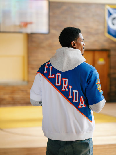 Our Florida shooting shirt is inspired heavily by the warmups the Gators wore during the 1993-94 season, and serves as a bright, versatile layering piece. Featuring a vintage, 1994 NCAA Final Four logo, we specifically paid tribute to Florida men's basketball's first-ever Final Four appearance. Brought to you in partnership with College Vault.