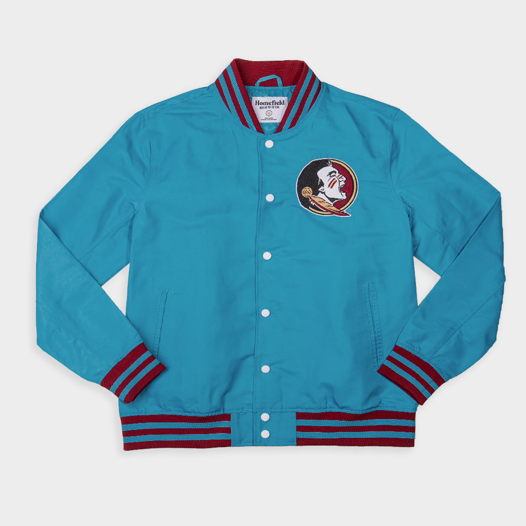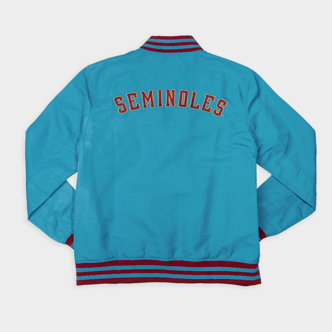 We designed a new, turquoise bomber jacket to honor Florida State's Seminole Heritage series. Paying respect to the Seminole tribe of Florida, the color turquoise often represents unity and fellowship in many indigenous American cultures. As Florida State does with its Heritage Night uniforms, we added garnet and gold accents to the jacket, to tie all the elements in this unique jacket together.