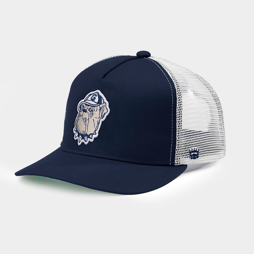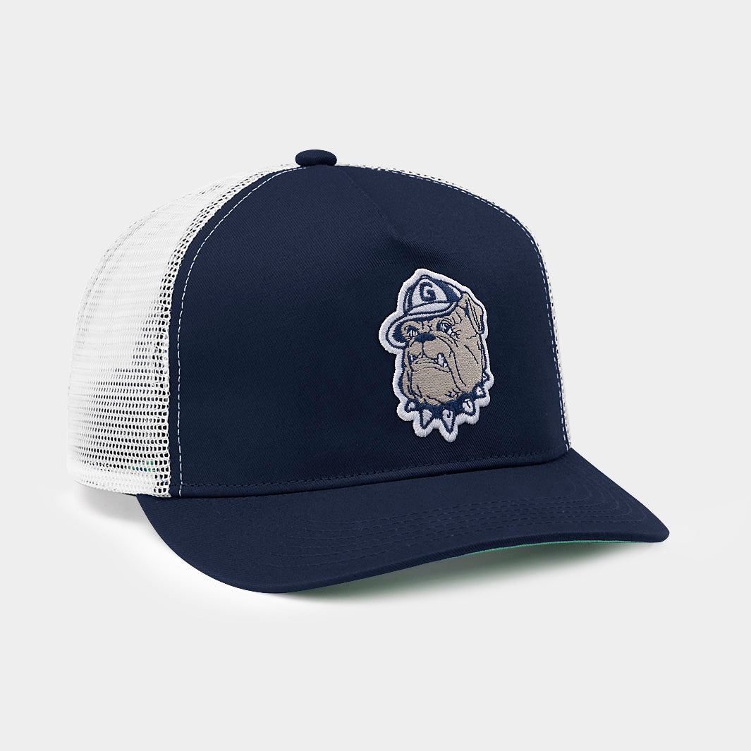 This vintage Jack the bulldog, featured here on this Georgetown trucker hat, was used from 1978 to 1995. Among other athletic feats, he saw the Hoyas through their incredible run to win the 1984 men's basketball national championship.