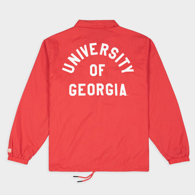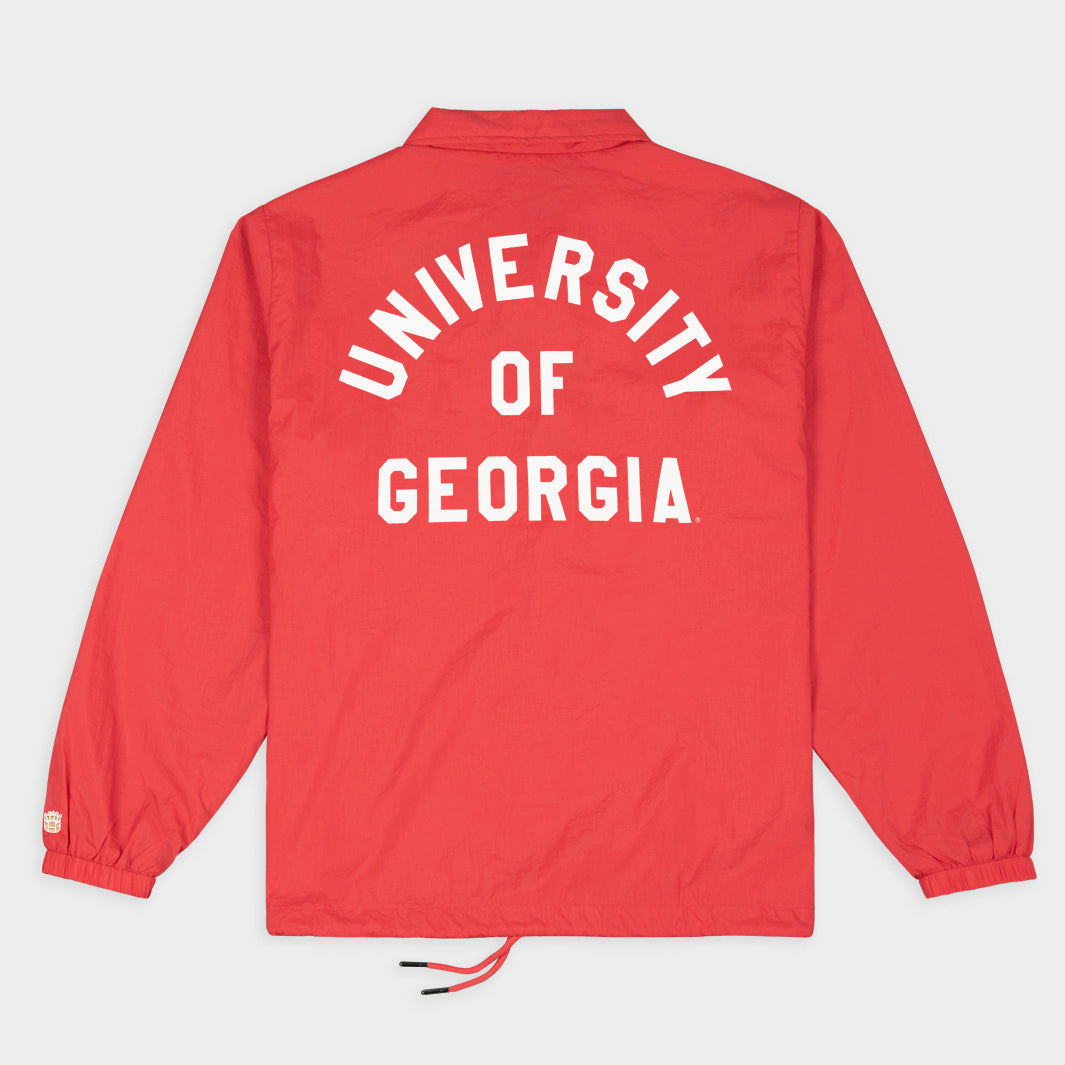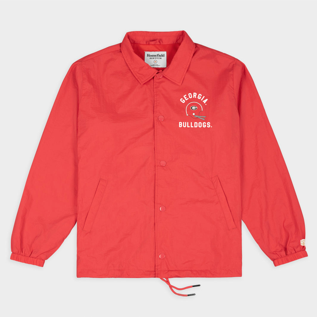 Through the late 1960s and '70s, football coaching staffs transitioned their sideline wardrobes from full suits and ties to light, workmen-style jackets; these coaches jackets were predecessors to the more spirited, uniformly branded looks we see on the sidelines today. Our take on a Georgia coaches jacket matches era-appropriate typefaces and logos with the structured collar and boxy fit of a vintage jacket. Made with durable-yet-lightweight nylon, and high-quality snap plackets and drawcords, it's the perfect outer layer for your game day 'fit.