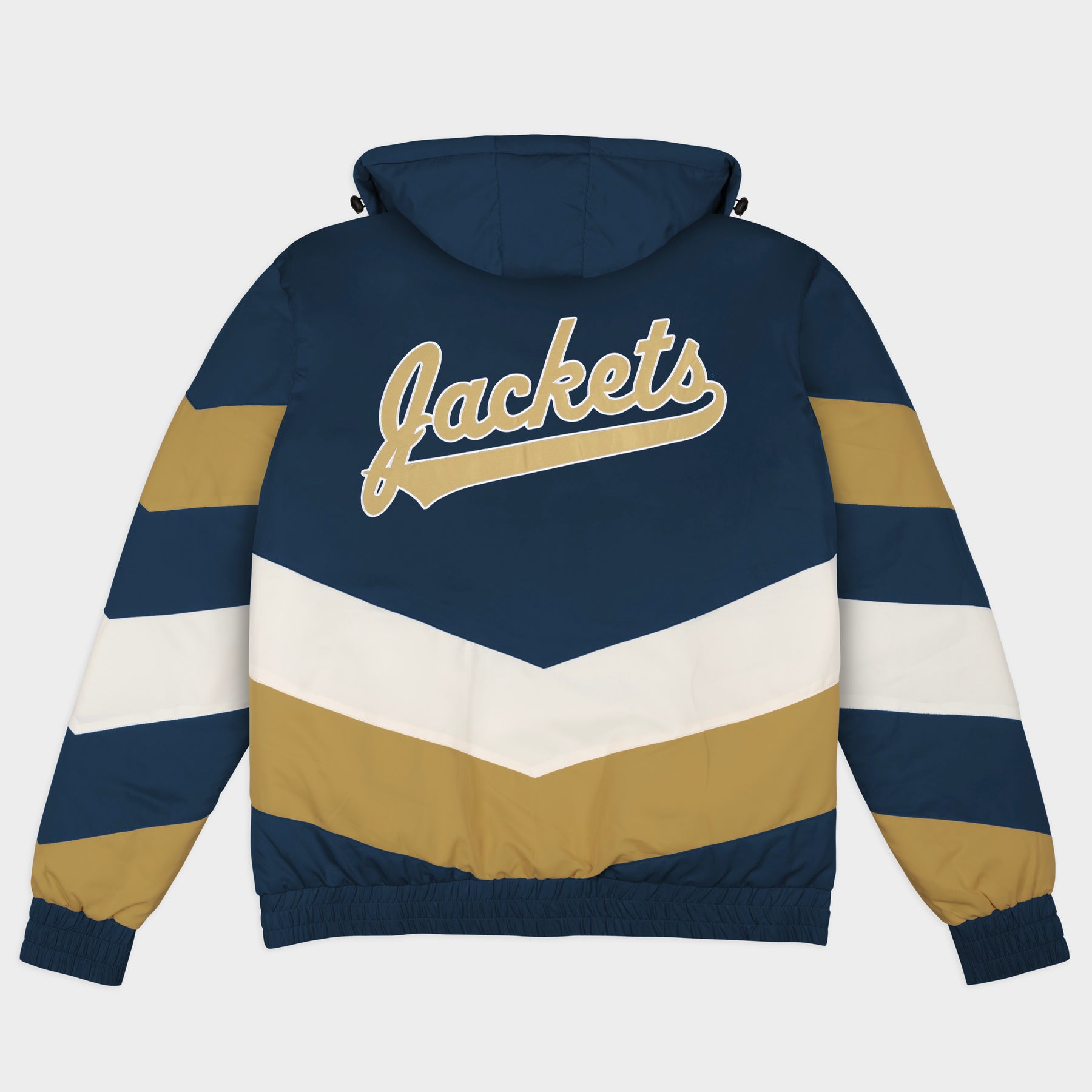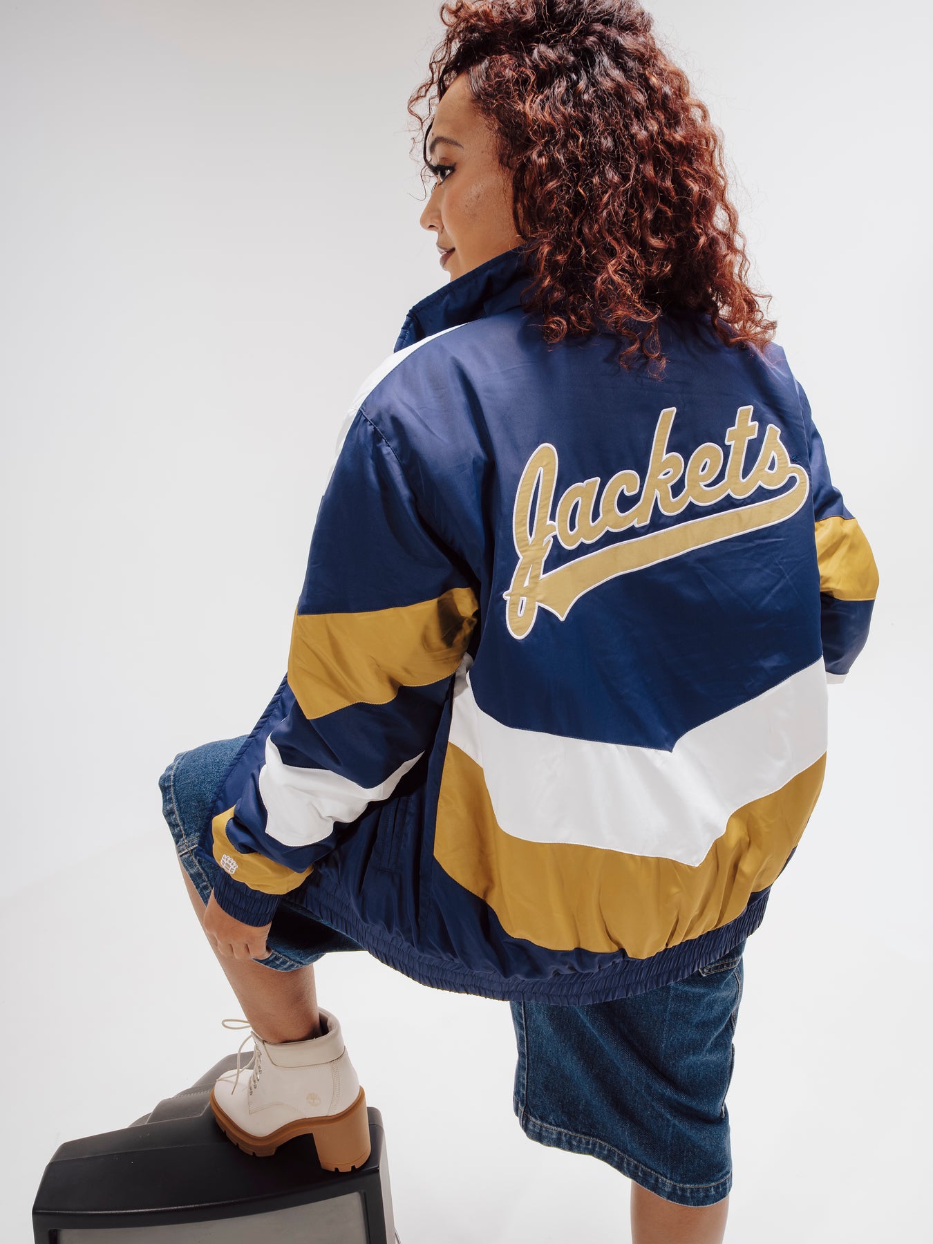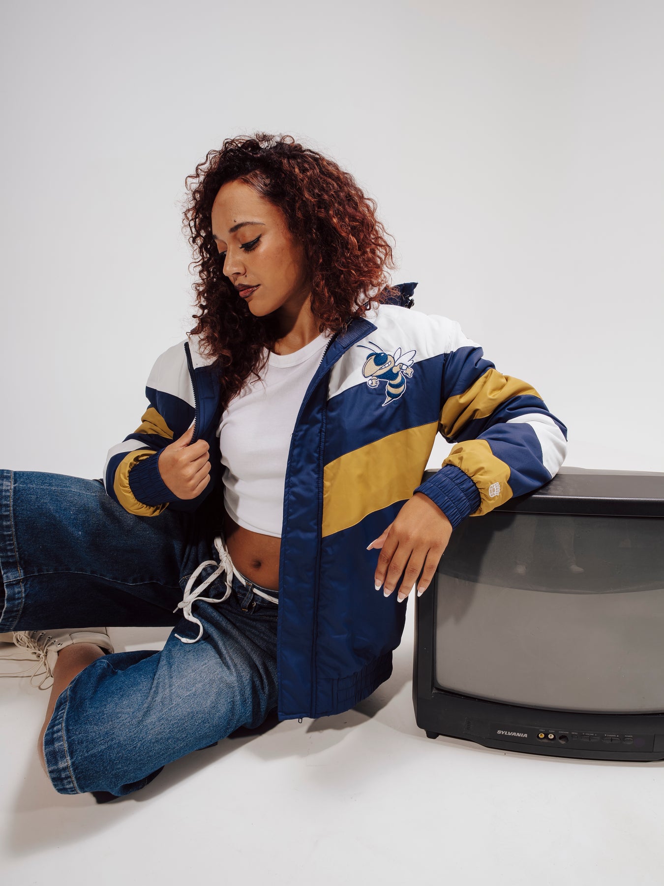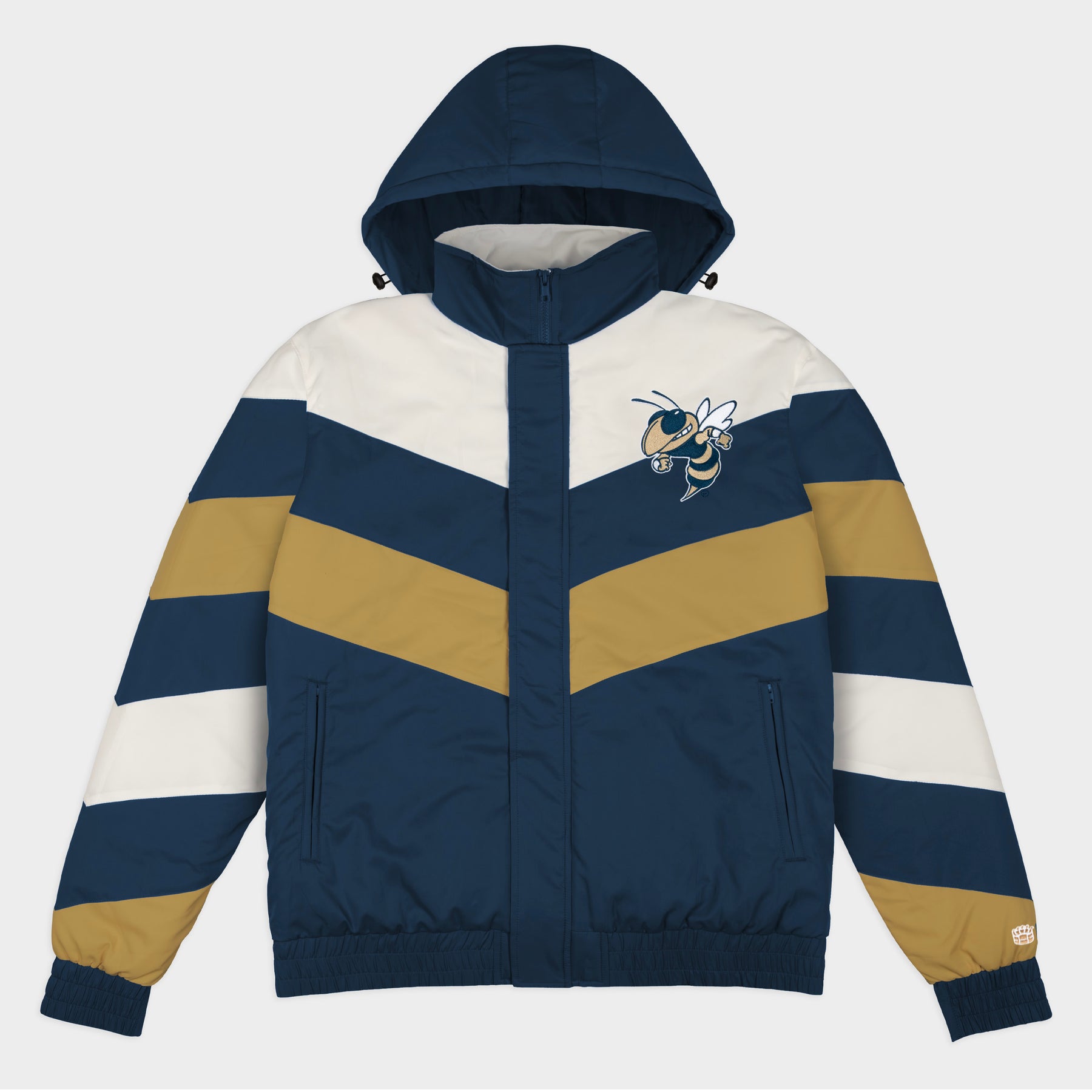 Change the winter jacket game with the Georgia Tech Gamebreaker Jacket. Inspired by the bold, maximal sportstyle jackets of the 1990s, each jacket is designed with a high neck and removable hood to withstand whatever elements the day throws at you. The chevron stripes and classic, vintage logos on the chest and back paint the quintessential game day fashion picture.