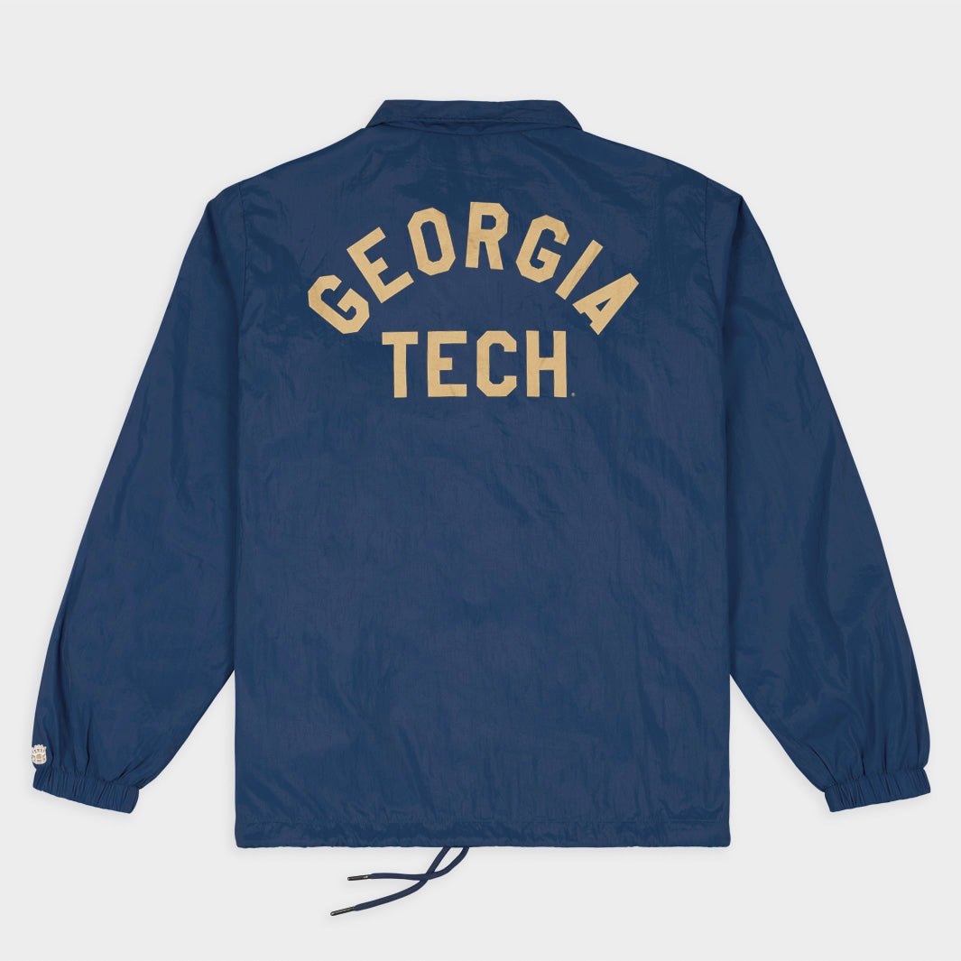 Through the late 1960s and '70s, football coaching staffs transitioned their sideline wardrobes from full suits and ties to light, workmen-style jackets; these coaches jackets were predecessors to the more spirited, uniformly branded looks we see on the sidelines today. Our take on a Georgia Tech coaches jacket matches era-appropriate typefaces and logos with the structured collar and boxy fit of a vintage jacket. Made with durable-yet-lightweight nylon, and high-quality snap plackets and drawcords, it's the perfect jacket for the Yellow Jackets.