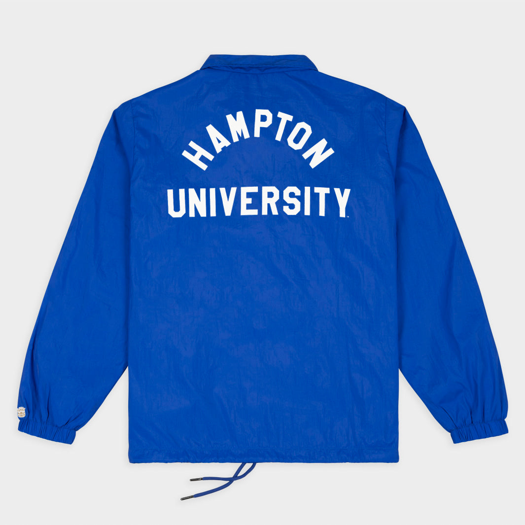Through the late 1960s and '70s, football coaching staffs transitioned their sideline wardrobes from full suits and ties to light, workmen-style jackets; these coaches jackets were predecessors to the more spirited, uniformly branded looks we see on the sidelines today. Our take on a Hampton coaches jacket matches era-appropriate typefaces and logos with the structured collar and boxy fit of a vintage jacket. Made with durable-yet-lightweight nylon, and high-quality snap plackets and drawcords, it's the perfect outer layer for a Hampton Football Saturday.