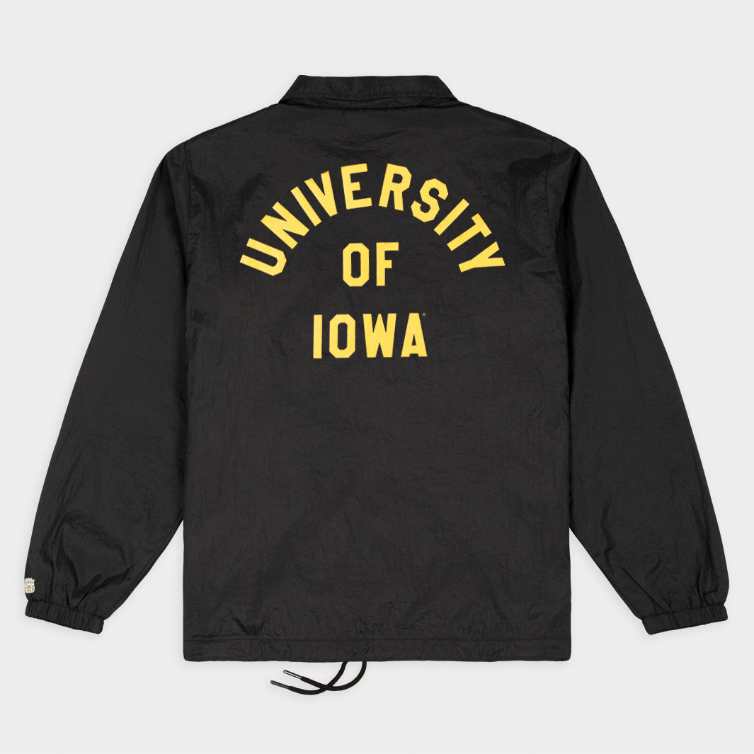 Through the late 1960s and '70s, football coaching staffs transitioned their sideline wardrobes from full suits and ties to light, workmen-style jackets; these coaches jackets were predecessors to the more spirited, uniformly branded looks we see on the sidelines today. Our take on an Iowa coaches jacket matches era-appropriate typefaces and logos with the structured collar and boxy fit of a vintage jacket. Made with durable-yet-lightweight nylon, and high-quality snap plackets and drawcords, it's the perfect outer layer for a brisk Football Saturday in Iowa City.