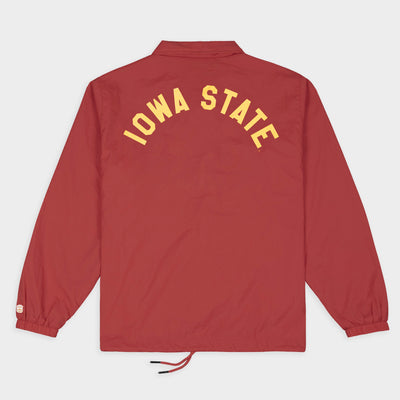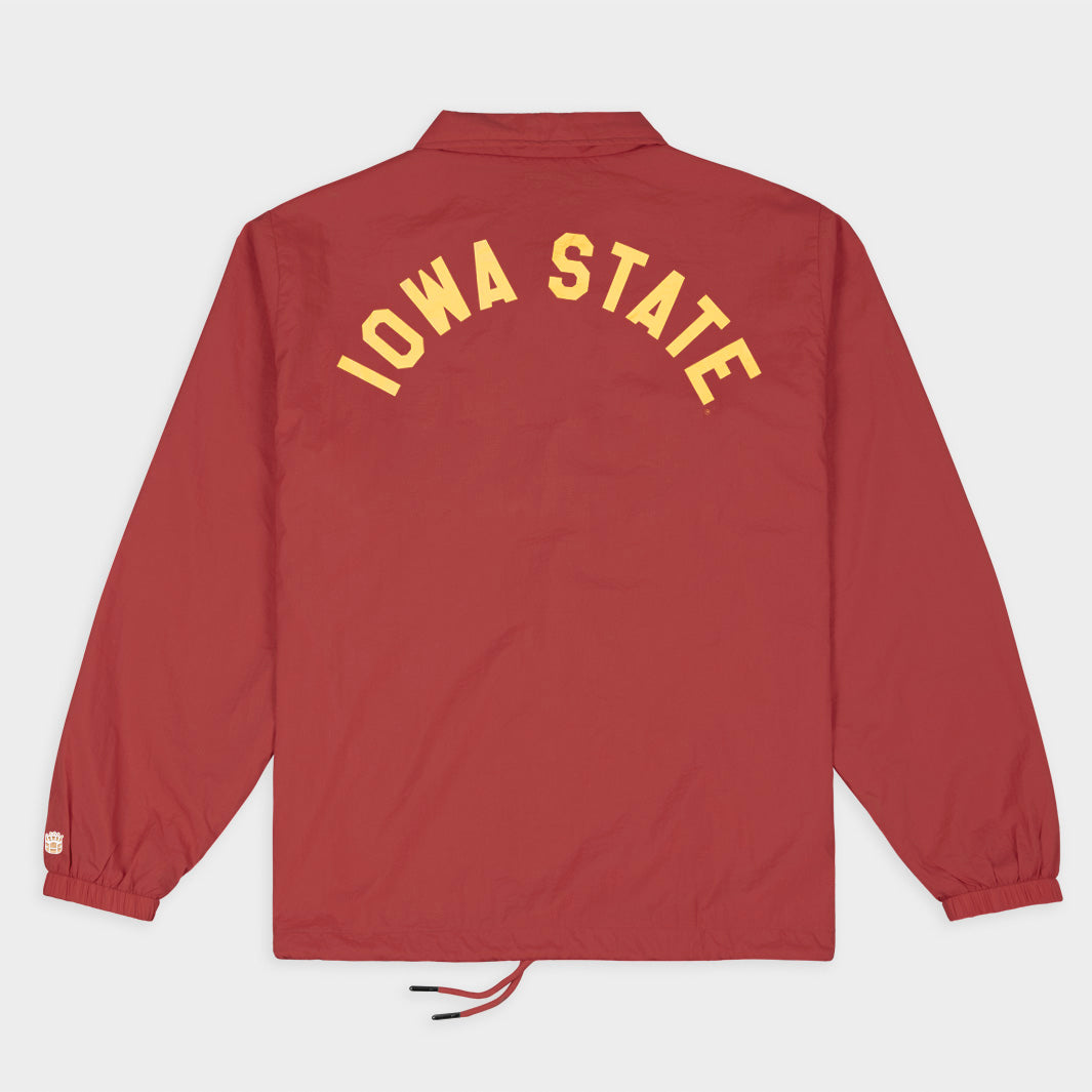 Through the late 1960s and '70s, football coaching staffs transitioned their sideline wardrobes from full suits and ties to light, workmen-style jackets; these coaches jackets were predecessors to the more spirited, uniformly branded looks we see on the sidelines today. Our take on an Iowa State coaches jacket matches era-appropriate typefaces and logos with the structured collar and boxy fit of a vintage jacket. Made with durable-yet-lightweight nylon, and high-quality snap plackets and drawcords, it's the perfect outer layer for a brisk Football Saturday in Ames.