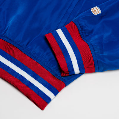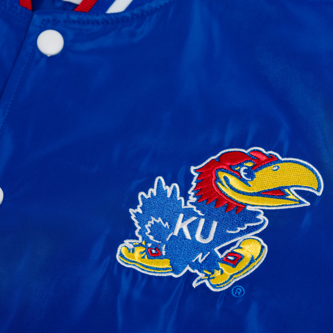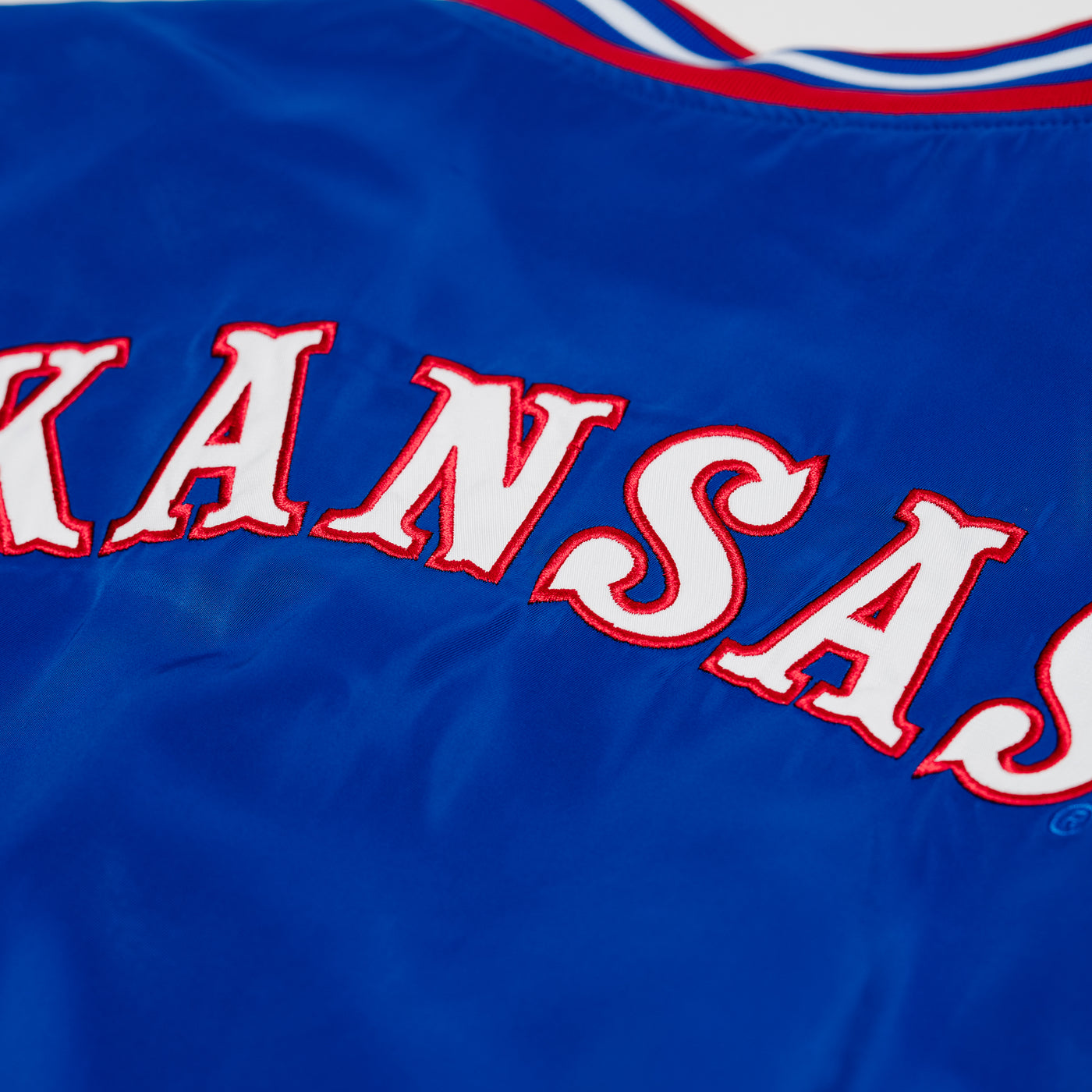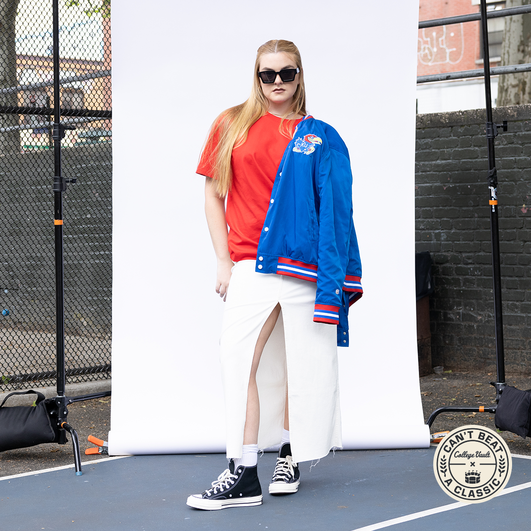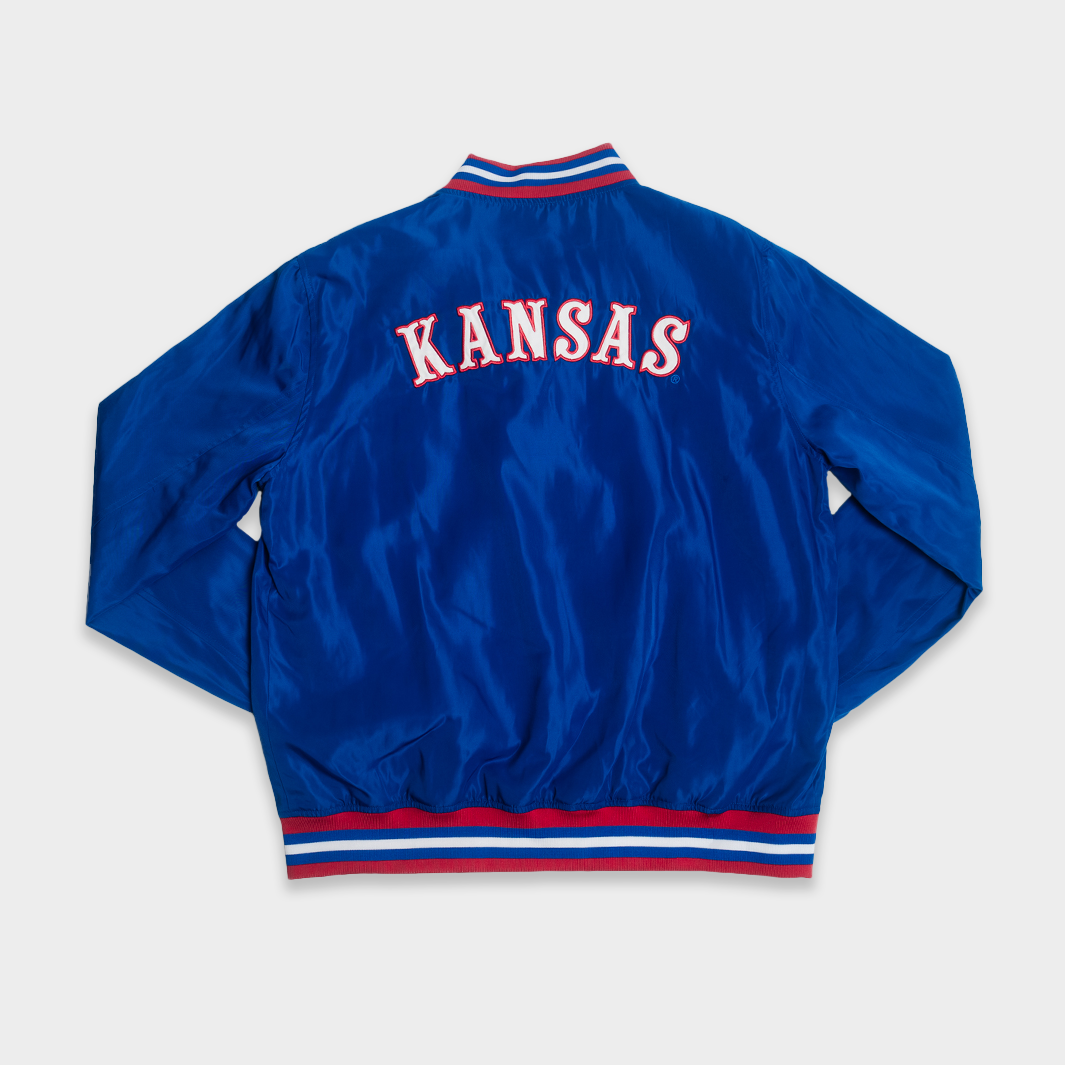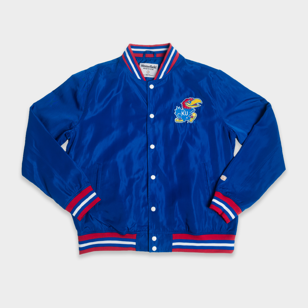 Just like you can't miss this arched "Kansas" on the back of this vintage-inspired bomber jacket, you can’t miss the giant display letters in the same font when you walk in Allen Fieldhouse. Jayhawks faithful know these beloved letters with a winning history as the “Circus Font," worn across the chests of 1990s legends like Paul Pierce, Jacque Vaughn, Raef LaFrentz, and Scot Pollard. To add even more character to this jacket, we used a vintage version of the Jayhawk logo beloved nationwide. Brought to you in partnership with College Vault.
