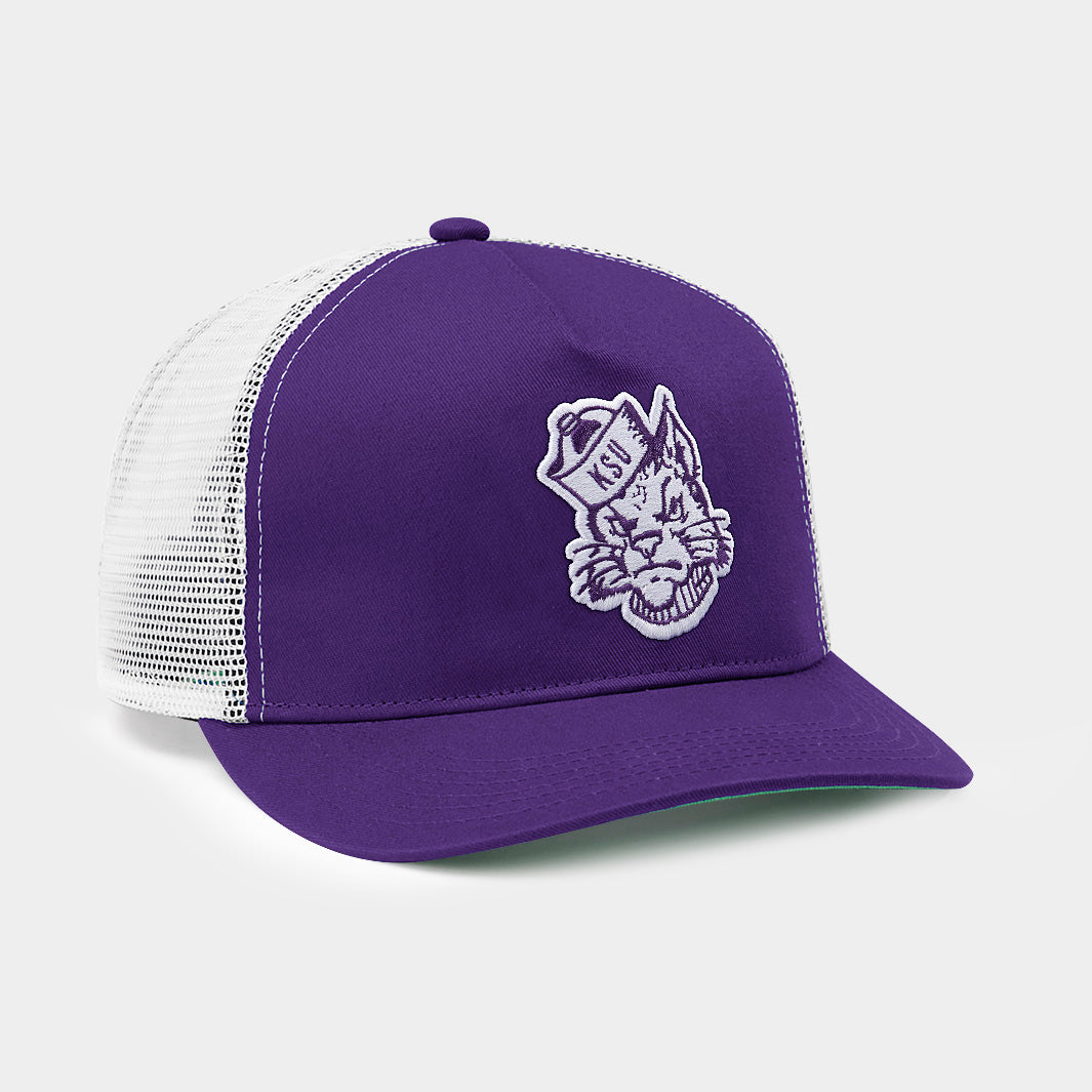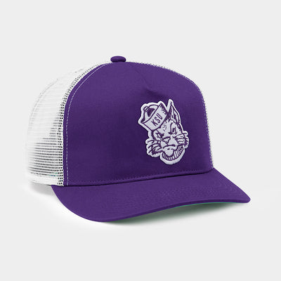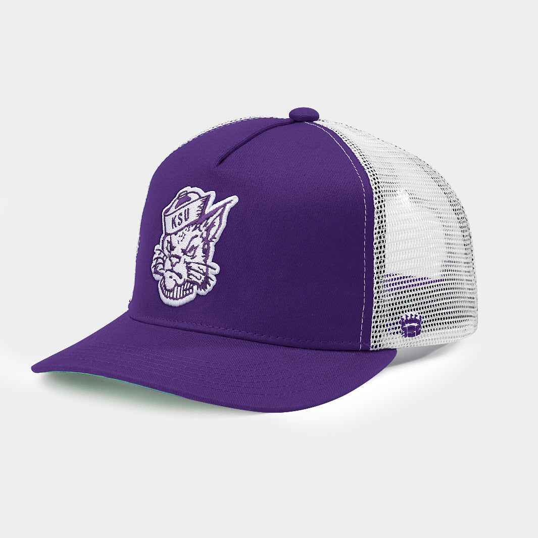 Like many schools in the mid-19th century, Kansas State featured a wildcat in a sailor hat on much of its memorabilia and keepsakes. We found a version similar to this wildcat head on a 1971 whiskey decanter box, and it just made sense for us to put this wildcat in a hat on a hat.