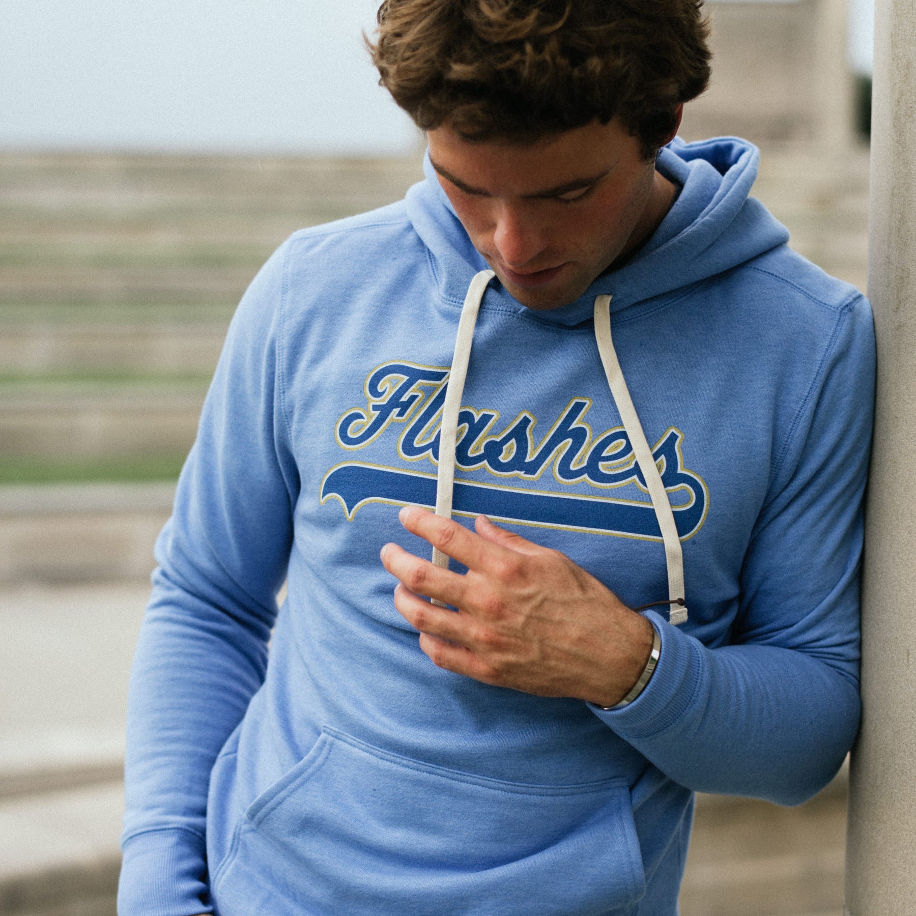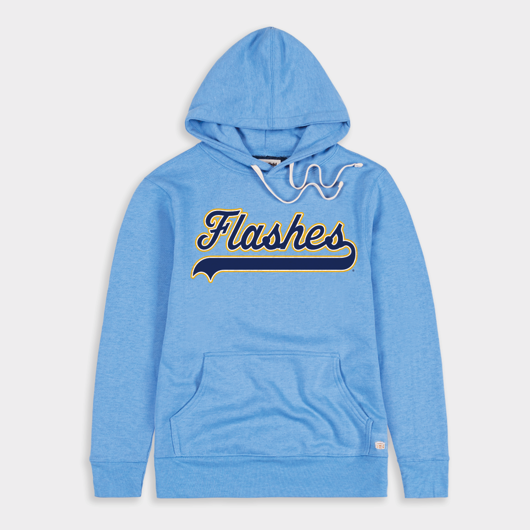 We took Kent State’s script “Flashes” and set it on sky blue, mimicking our favorite Kent State baseball and softball uniforms. Golden Flashes baseball and softball both began to challenge for conference titles in earnest from the early ‘90s to the present day, and both have made a College World Series appearance.