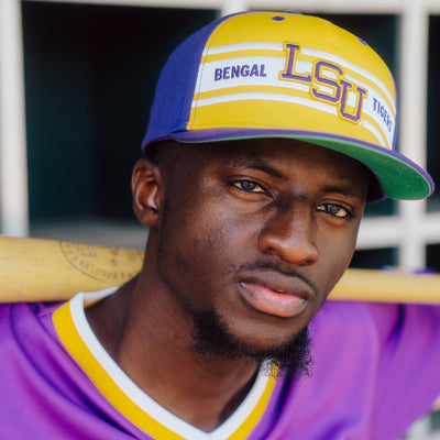 LSU baseball had some incredible hats and uniforms throughout its history, but we were particularly inspired by the caps the team wore in the late ‘80s for this high-crown baseball snapback. For fans of the Tigers, it might bring back memories of Albert Belle’s time on the team, or their three College World Series appearances in 1986, 1987, and 1989. Brought to you in partnership with College Vault.