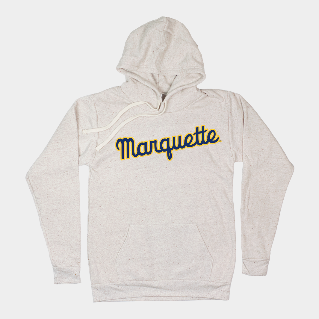 Enjoy this beautiful Marquette script on our most comfortable oatmeal hoodie.