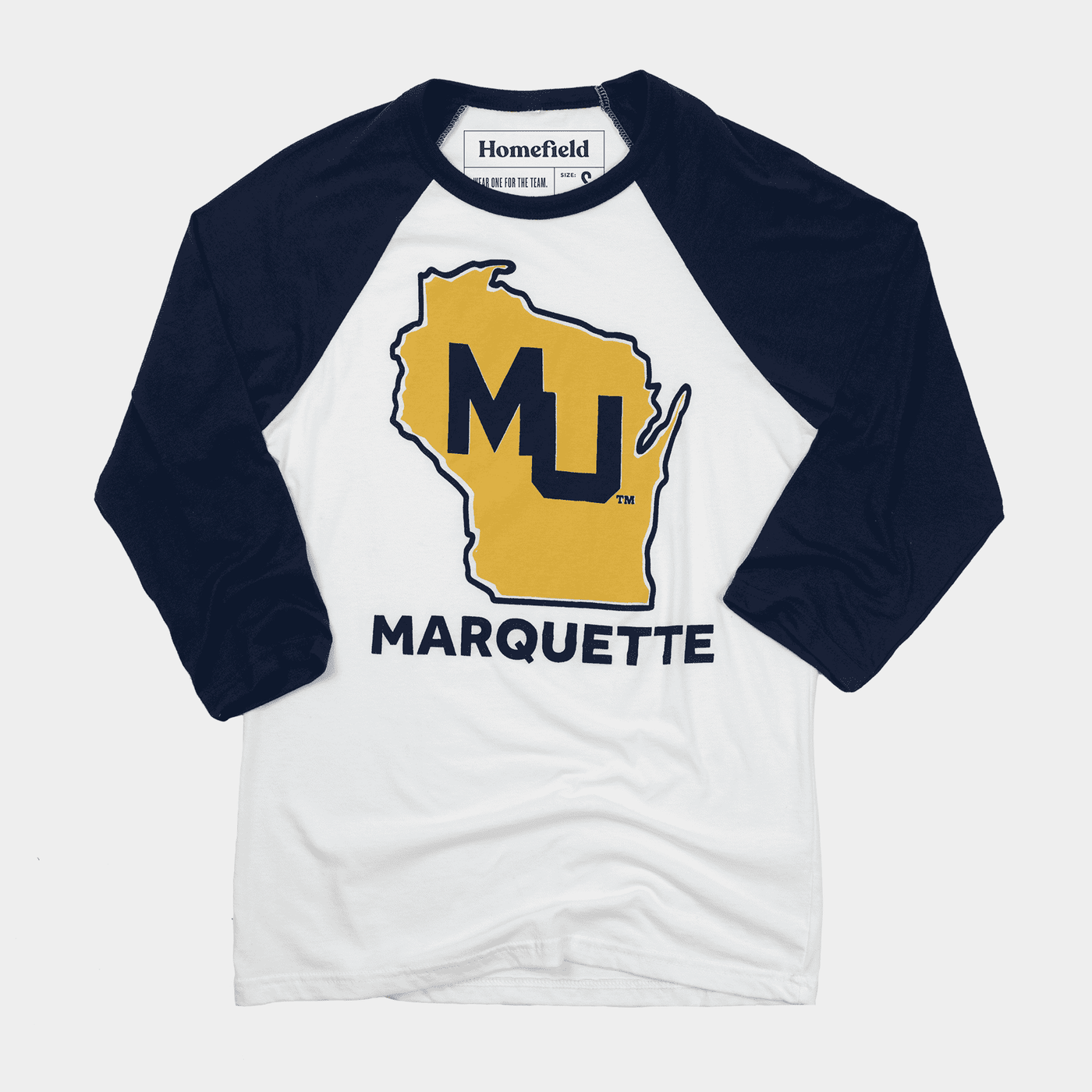 Marquette has brought the state of Wisconsin their only basketball national championship in 1977. This design is a nod to that title, with the vintage MU logo from the 70s across the state. Printed on an incredibly comfortable 3/4 sleeve baseball tee.