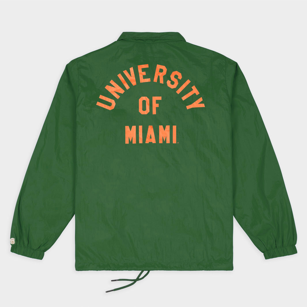 Through the late 1960s and '70s, football coaching staffs transitioned their sideline wardrobes from full suits and ties to light, workmen-style jackets; these coaches jackets were predecessors to the more spirited, uniformly branded looks we see on the sidelines today. Our take on a Miami coaches jacket matches era-appropriate typefaces and logos with the structured collar and boxy fit of a vintage jacket. Made with durable-yet-lightweight nylon, and high-quality snap plackets and drawcords, it's the perfect outer layer for your game day 'fit.