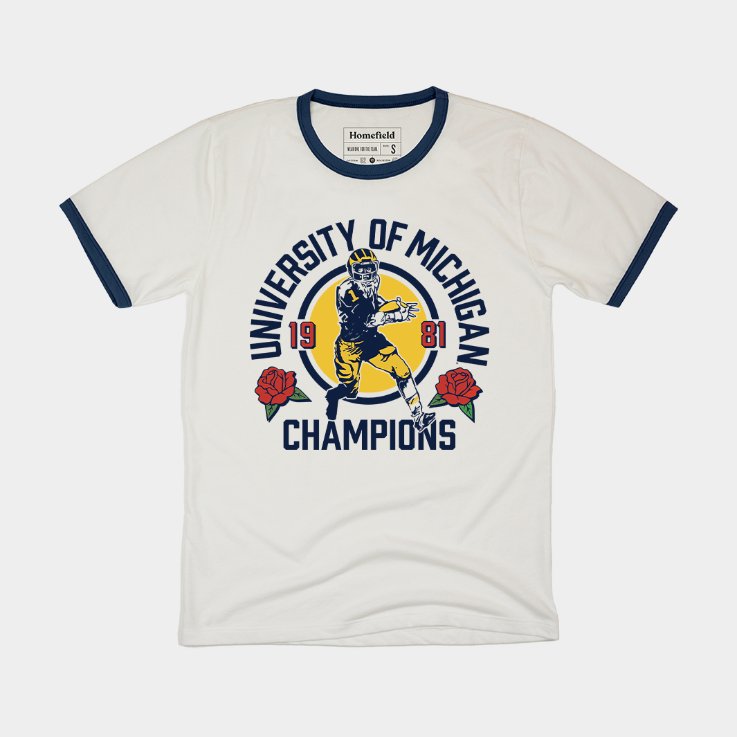 We found a commemorative Rose Bowl tee from the 1970’s and re-envisioned it as a champ tee for the Wolverines’ 1981 win over Washington. Michigan was on a rough seven-bowl losing streak – including their last five Rose Bowls – but won soundly over the Huskies this time around, 23-6. Brought to you in partnership with College Vault.