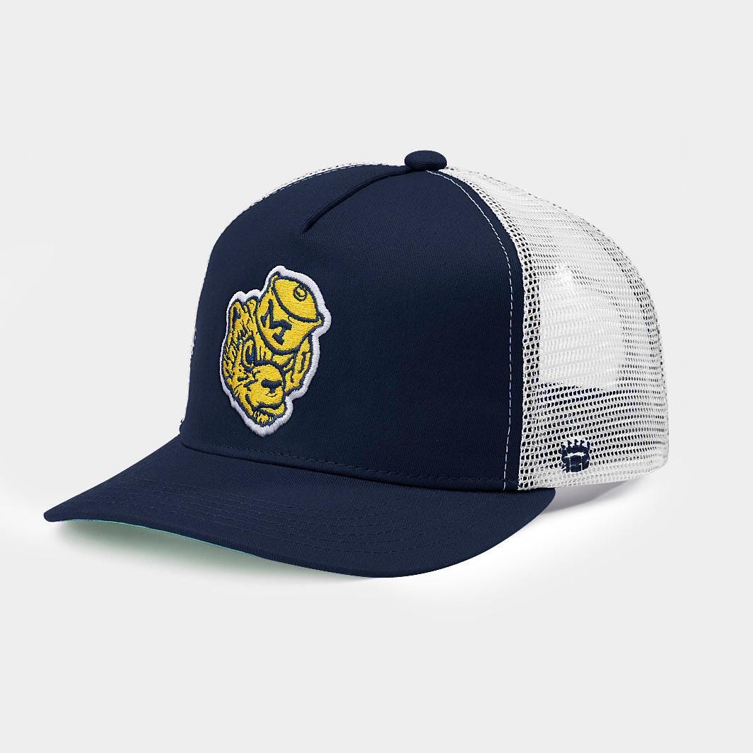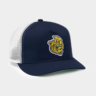 Michigan does not officially have a mascot, but this wolverine-bear wearing a sailor hat is beloved among fans of the Maize and Blue. We set him on this retro-style trucker hat, because there's no better place for a mascot wearing a hat... than on a hat.