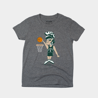 This vintage design is a slam dunk if you ask us. Sparty is one of the stars of the Breslin Center, an events hub in East Lansing and, of course, home of MSU men’s and women’s hoops. Imagine how wild the Izzone would go if Sparty pulled off a dunk like this. Brought to you in partnership with College Vault.