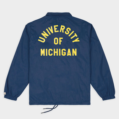 Through the late 1960s and '70s, football coaching staffs transitioned their sideline wardrobes from full suits and ties to light, workmen-style jackets; these coaches jackets were predecessors to the more spirited, uniformly branded looks we see on the sidelines today. Our take on a Michigan coaches jacket matches era-appropriate typefaces and logos with the structured collar and boxy fit of a vintage jacket. Made with durable-yet-lightweight nylon, and high-quality snap plackets and drawcords, it's the perfect outer layer for a brisk Football Saturday at the Big House.