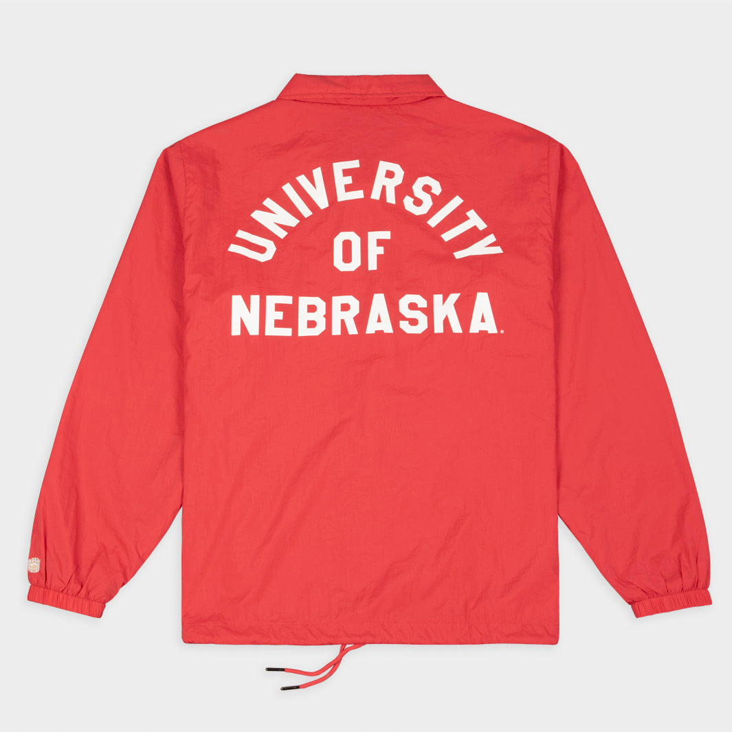 Through the late 1960s and '70s, football coaching staffs transitioned their sideline wardrobes from full suits and ties to light, workmen-style jackets; these coaches jackets were predecessors to the more spirited, uniformly branded looks we see on the sidelines today. Our take on a Nebraska coaches jacket matches era-appropriate typefaces and logos with the structured collar and boxy fit of a vintage jacket. Made with durable-yet-lightweight nylon, and high-quality snap plackets and drawcords, it's the perfect outer layer for a brisk Football Saturday in Lincoln.