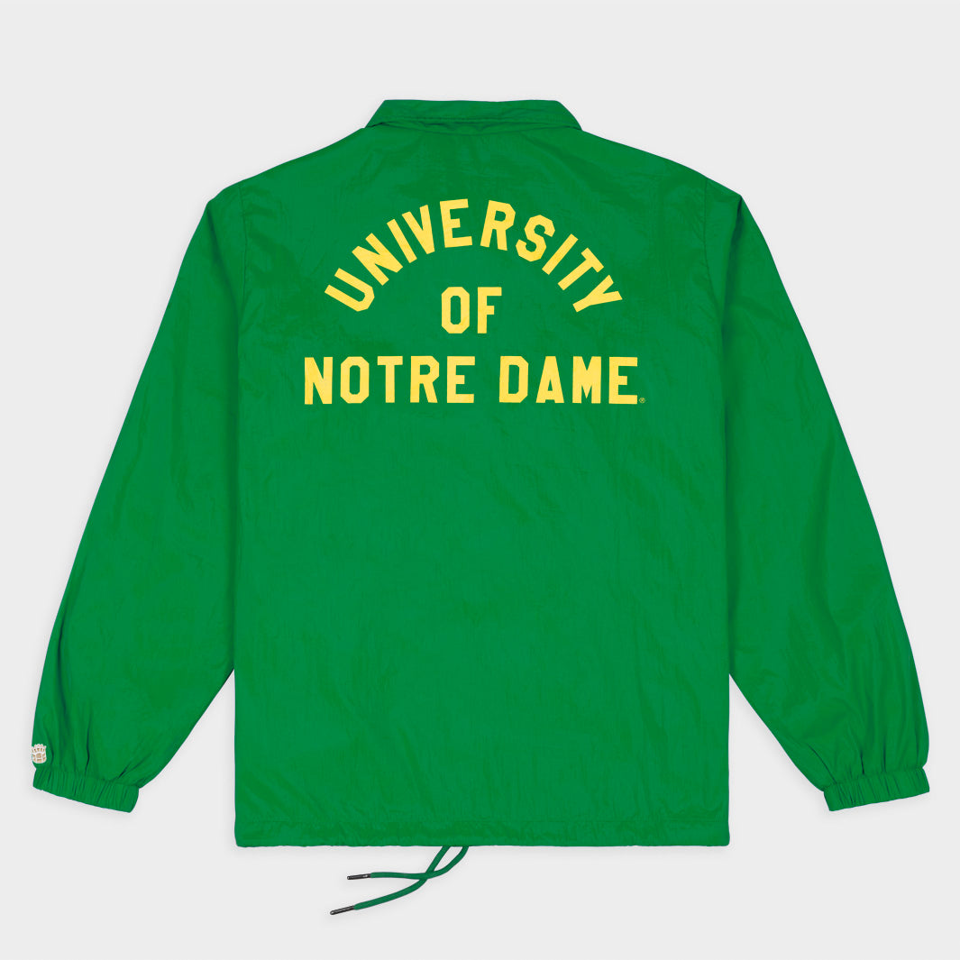 Through the late 1960s and '70s, football coaching staffs transitioned their sideline wardrobes from full suits and ties to light, workmen-style jackets; these coaches jackets were predecessors to the more spirited, uniformly branded looks we see on the sidelines today. Our take on a Notre Dame coaches jacket matches era-appropriate typefaces and logos with the structured collar and boxy fit of a vintage jacket. Made with durable-yet-lightweight nylon, and high-quality snap plackets and drawcords, it's the perfect outer layer for a brisk Football Saturday in South Bend.
