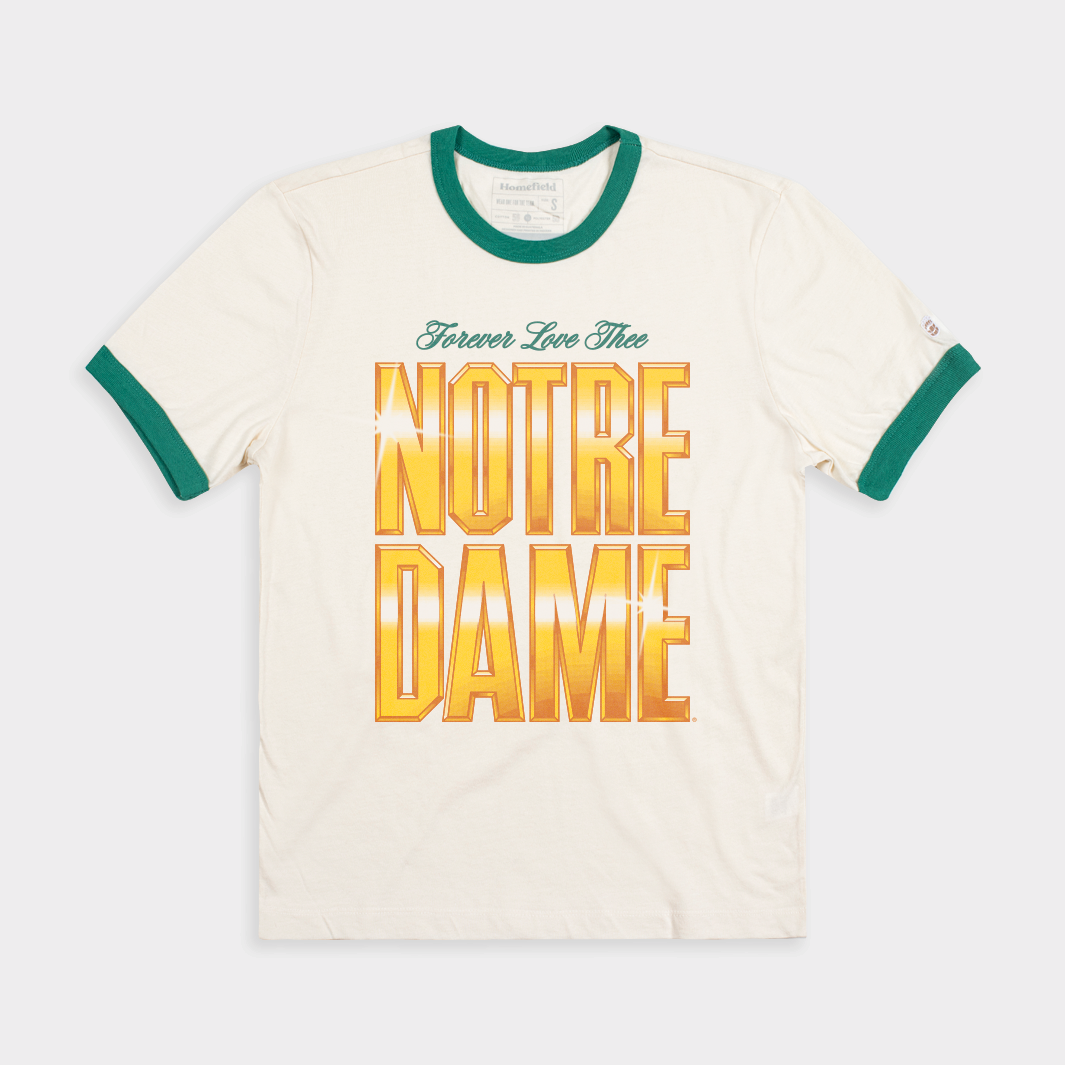 We paired this bold "Notre Dame" type, inspired by a 1987 game ticket, with words from the alma mater that have long been a Notre Dame rallying point: "...our hearts forever love thee Notre Dame."