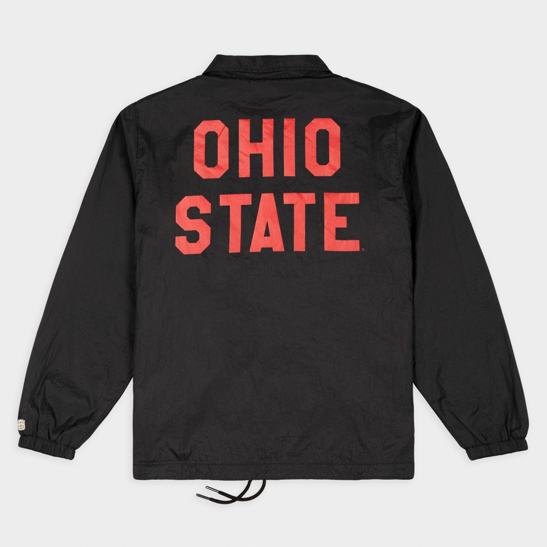Through the late 1960s and '70s, football coaching staffs transitioned their sideline wardrobes from full suits and ties to light, workmen-style jackets; these coaches jackets were predecessors to the more spirited, uniformly branded looks we see on the sidelines today. Our take on an Ohio State coaches jacket matches era-appropriate typefaces and logos with the structured collar and boxy fit of a vintage jacket. Made with durable-yet-lightweight nylon, and high-quality snap plackets and drawcords, it's the perfect outer layer for a brisk Football Saturday at the Shoe.