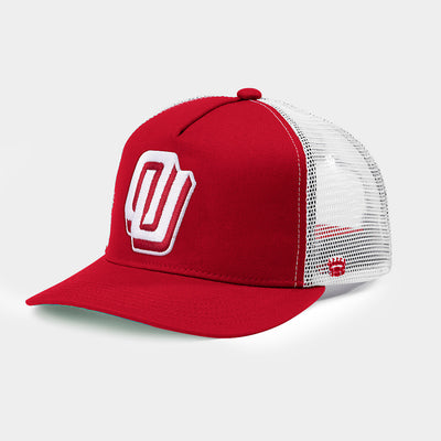 This iconic, interlocked OU logo was used officially from 1979 to 2000. Known affectionately as the “Disco” logo, it evokes fond memories for Sooners, particularly their football national championship in 1985. Set on a retro trucker hat, it's a different take on the ballcap made famous in the movie Twister, which featured the same logo.