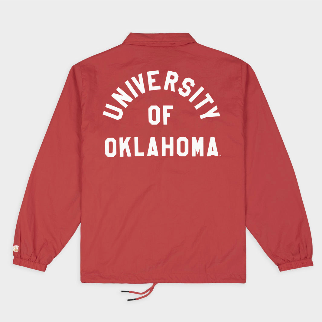 Through the late 1960s and '70s, football coaching staffs transitioned their sideline wardrobes from full suits and ties to light, workmen-style jackets; these coaches jackets were predecessors to the more spirited, uniformly branded looks we see on the sidelines today. Our take on an OU coaches jacket matches era-appropriate typefaces and logos with the structured collar and boxy fit of a vintage jacket. Made with durable-yet-lightweight nylon, and high-quality snap plackets and drawcords, it's the perfect outer layer for a brisk Football Saturday in Norman.